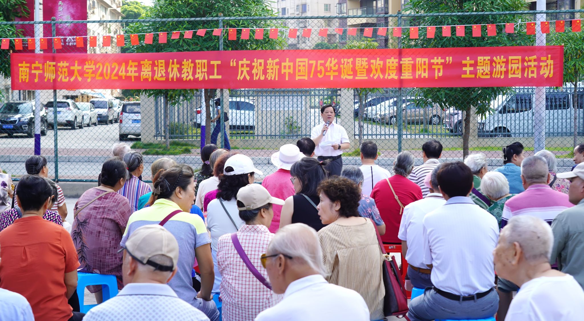 10月13日上午,我校分别在明秀、长岗、建政三个校区同时举办离退休教职工游园活动,共同庆祝中华人民共和国成立75周年暨欢度重阳佳节。学校党委副书记侯代忠出席活动并致辞,500余名离退休教职工参加了活动。