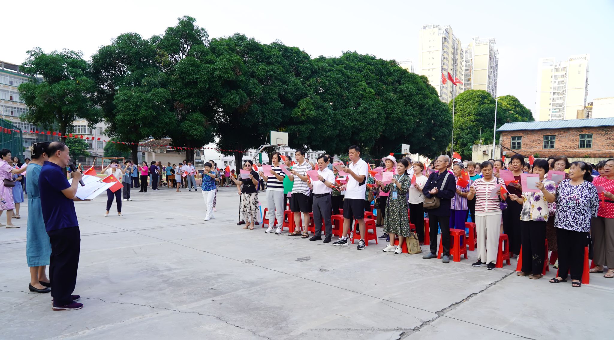 活动在嘹亮的歌声中拉开序幕。当《歌唱祖国》《祖国颂》《团结就是力量》一首首熟悉的旋律响起,整个校园瞬间被激情点燃。老同志们一齐挥舞手中的国旗,高亢激昂地唱响对祖国的赞歌。他们还在“祝福墙”展板上写下“永远跟党走”“愿祖国繁荣昌盛”“退休不褪色,银发映初心”等美好愿望和铮铮誓言。