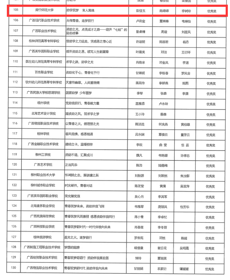 在2024年全区“青春筑梦新时代,资助伴我向未来”资助主题征文比赛中,我校获高校组一等奖、优秀奖各1项,优秀指导教师奖2项,充分展示了学校在资助育人领域的显著成效。