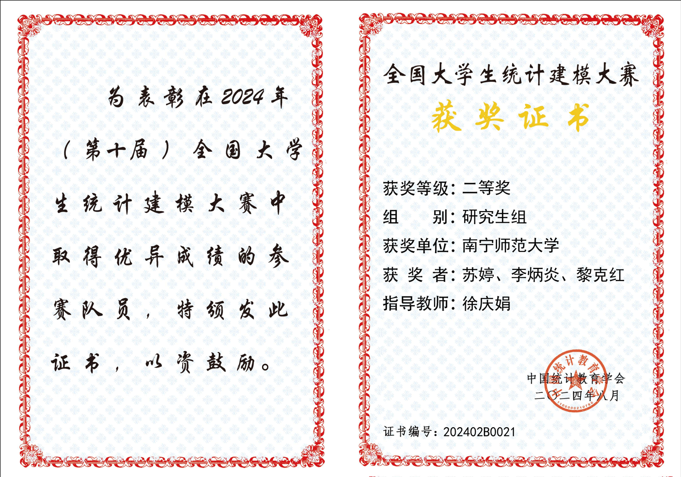 我校学子2022年首次报名参加全国大学生统计建模大赛。2022年获得广西赛区本科生组一等奖1项、二等奖1项,以及研究生组一等奖1项。2023年共获得广西赛区本科生组一等奖4项、二等奖2项、三等奖1项,以及研究生组二等奖和三等奖各1项。成绩的背后,充分展现了我校学子团结协作、勇于创新和努力拼搏的精神。