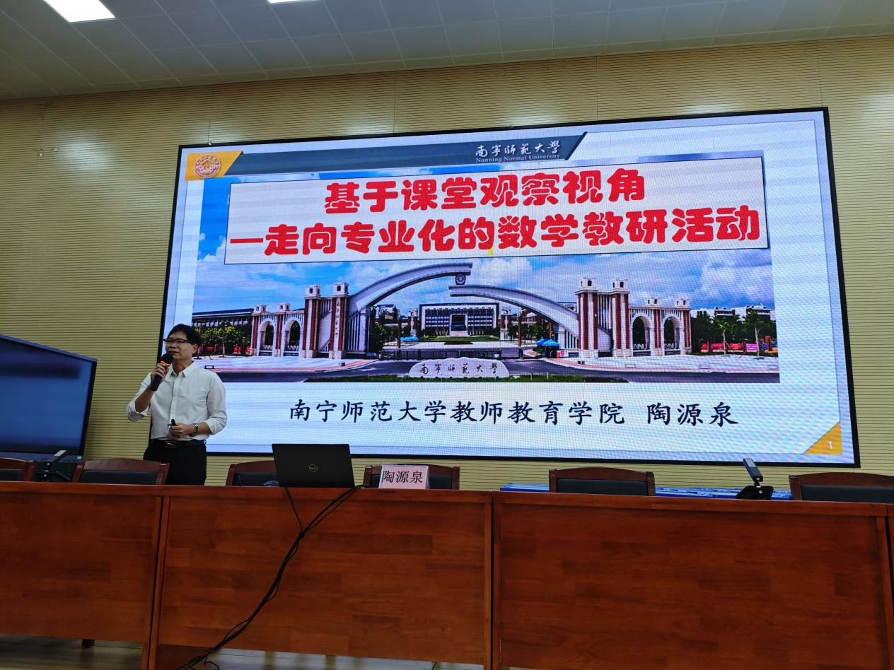 10月25日上午在靖西市开展边境数学教育大中小一体化建设系列活动。靖西市教育局局长杨景山等相关人员参加了活动。活动分为三个内容,一是全体调研组成员与靖西市教育局局长杨景山等相关人员就靖西市数学教育大中小一体化建设、边境地区基础教育现状及存在的问题和困难、学生就业和实习等问题开展研讨交流;二是广西现代教育杂志社名誉社长兼总编辑黎海英为靖西市中小学、幼儿园教师作了“教育教学论文写作与投稿”的讲座,为广大教师提供切实的写作技巧和投稿能力的培训;三是教师教育学院副院长陶源泉为城区初中学校七、八年级数学科任教师和各乡(镇)初中数学科教研组长和七、八年级备课组作“基于课堂观察视角---走向数学专业的听评课教研活动”的讲座,并在此基础上开展数学与统计学院学科教学(数学)研究生与靖西市教师进行同课异构活动。