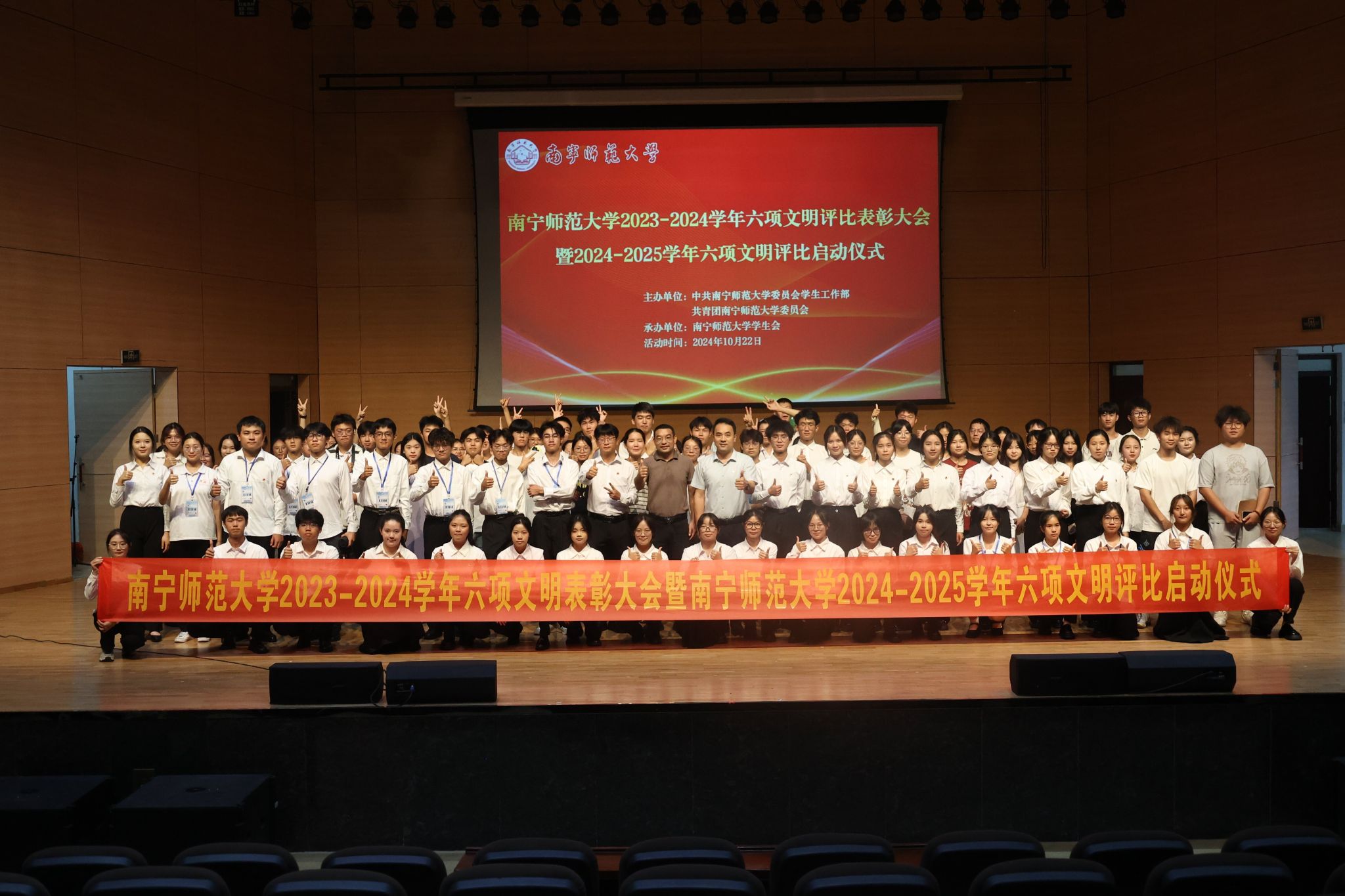 党委学生工作部、校团委负责人分别为获得2023-2024学年六项文明评比“先进个人”“文明班级”“文明学院”的代表颁奖。校团委副书记何俊斌为本次活动作总结讲话,他充分肯定了过去一年六项文明评比活动中取得的成绩,同时对新学年的六项文明评比工作提出了三点希望:一是凝聚理想共识,提高文明素养;二是深化交流协作,搭建沟通桥梁;三是学会共建共享,铸就和谐校园。党委学生工作部副部长何健宣布南宁师范大学2024-2025学年六项文明评比活动正式开启。