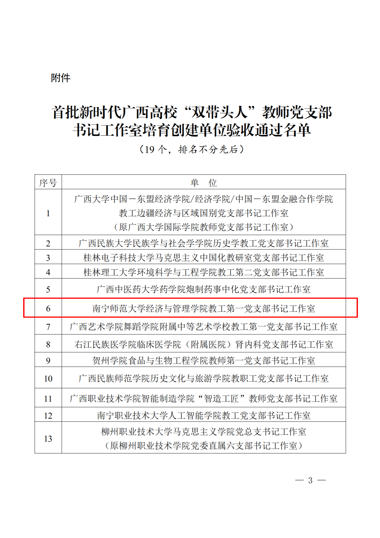 近日,自治区党委教育工作委员会印发了《自治区党委教育工委关于公布首批新时代广西高校“双带头人”教师党支部书记工作室培育创建单位验收通过名单的通知》,我校经济与管理学院教工第一党支部书记工作室顺利通过验收。