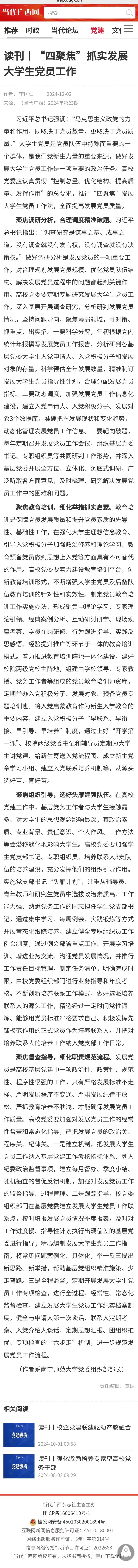 自治区党委机关刊物《当代广西》刊发我校党建工作理论文章“‘四聚焦’抓实发展大学生党员工作”