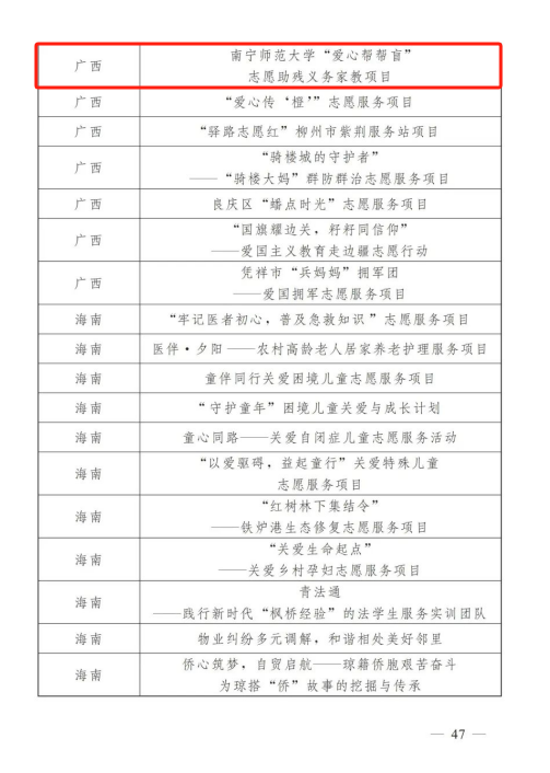我校曾被授予“全国志愿助残基地”,项目也曾入选2024年共青团为老志愿服务和助残志愿服务项目展示,荣获广西优秀志愿者项目等,并在2024年广西志愿服务项目大赛中荣获铜奖。