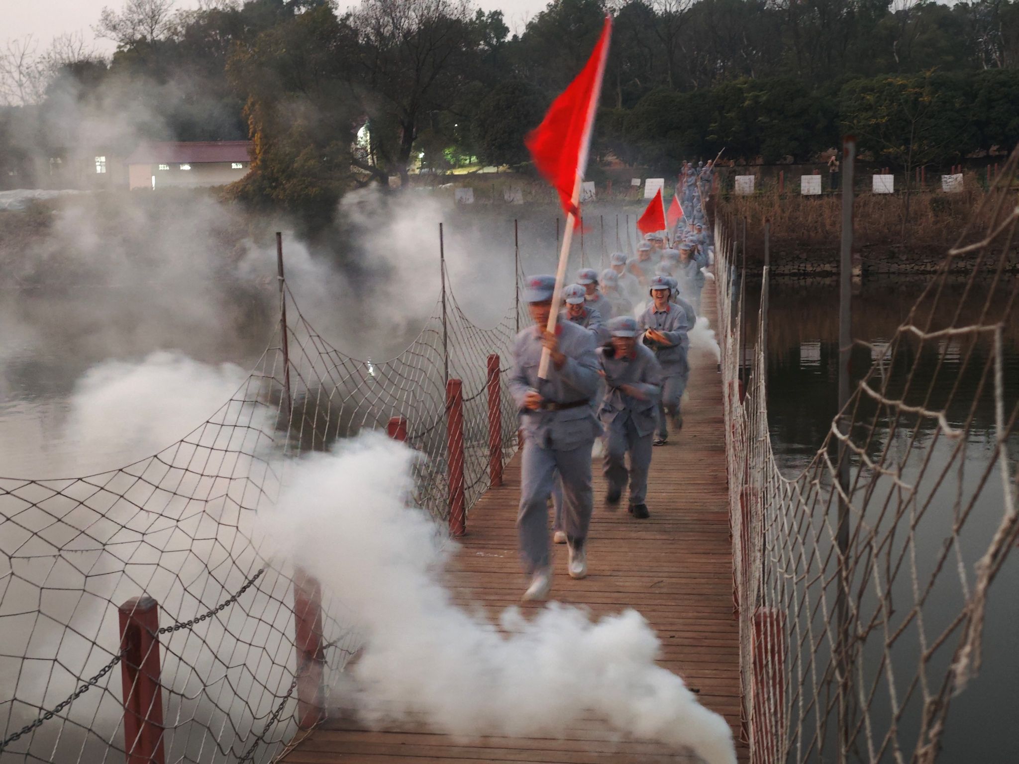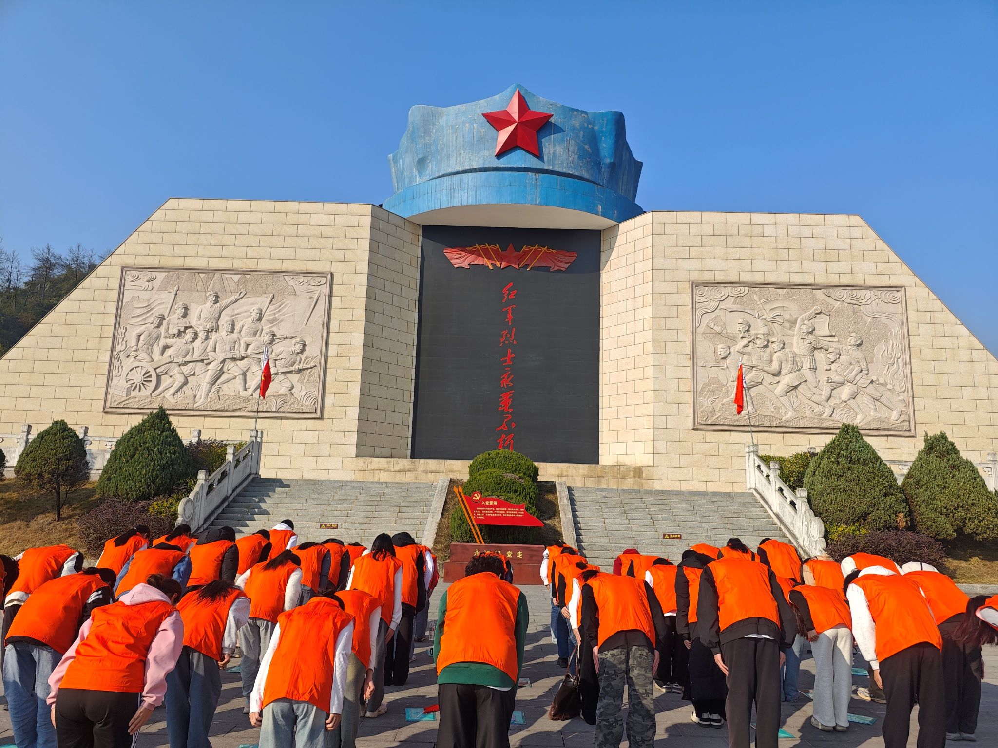 桂林研学团首先来到全州县绍水镇红军营开展湘江战役实景模拟,同学们头戴红军帽、身着红军服,在教官的指导下,不仅重温了军训,还轮流交替进行了“破译电台密码”“制作担架救助伤员”“训练持枪基础战术”等情景教学活动,模拟演练了踏过木桥强渡湘江、碉堡防敌以及抢占制高点等战斗场景,深刻体会到红军战士的坚定革命意志、顽强战斗精神和无私奉献精神,激励同学们铭记历史、缅怀先烈、珍惜当下、开创未来,在新时代新征程中奋勇前行。桂林研学团还依次走访了红军长征湘江战役纪念馆、红军长征湘江战役纪念园以及社会主义新农村——毛竹山村。在红军长征湘江战役纪念馆,研学团成员们认真参观了各个展厅,馆内陈列着大量珍贵的历史文物和图片资料,生动再现了湘江战役的悲壮历程;在湘江战役纪念碑林,每一座纪念碑都铭记着一位革命先烈的英勇事迹。研学团成员们怀着崇敬的心情,向纪念碑敬献了花圈;在毛竹山村,同学们进行实地考察、走访调研等活动,用实际行动为乡村振兴注入青春力量。研学团还参观了灌阳新圩阻击战酒海井红军纪念馆,走访了湘江光华铺阻击战旧址并开展志愿清扫活动。在兴安红军长征突破湘江烈士纪念碑园,研学团观看了红色革命舞台剧《血色湘江》,研学团成员们仿佛置身于那段波澜壮阔的历史之中,深刻感受到了革命先辈们的不朽功勋和伟大精神。