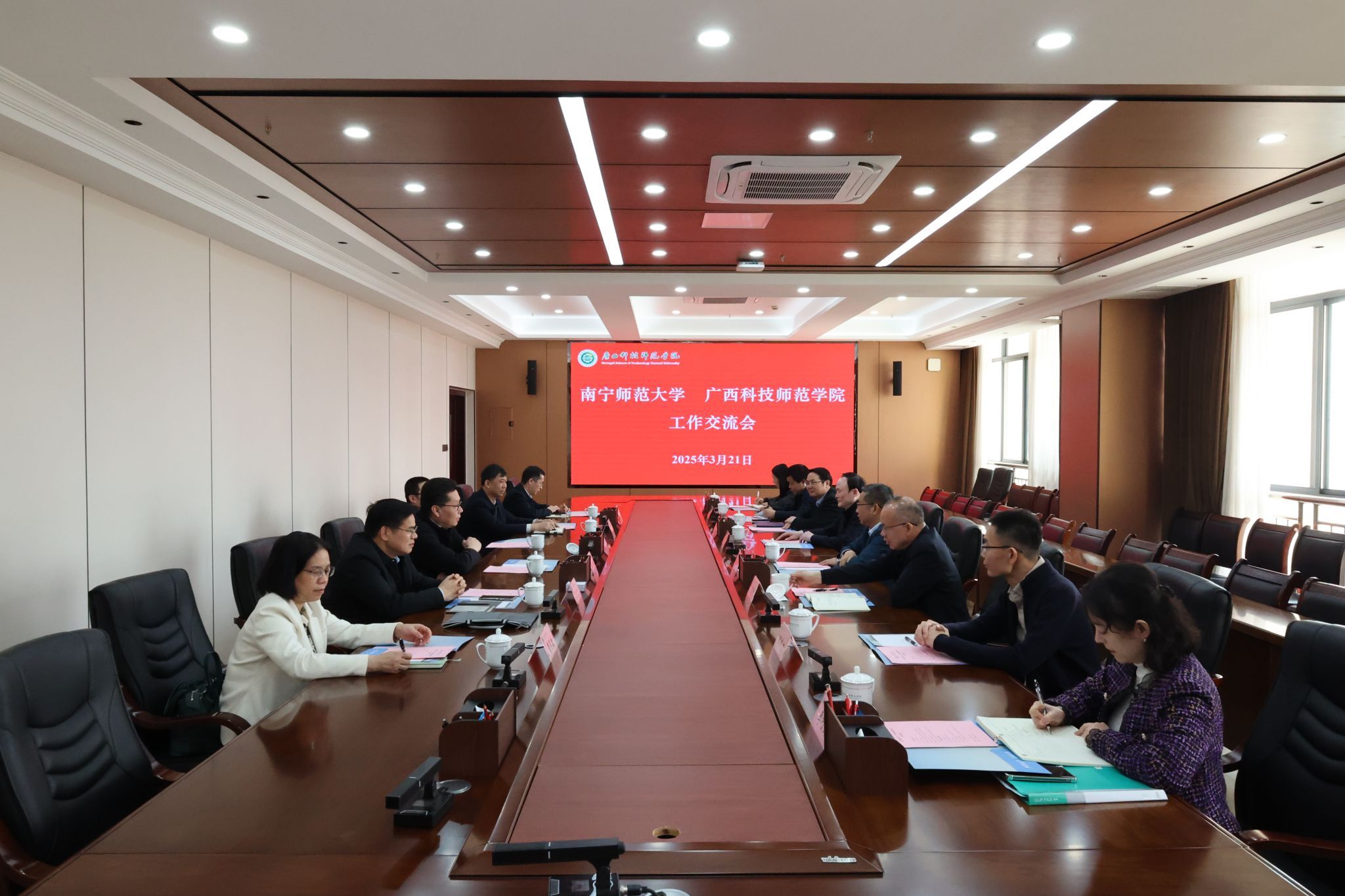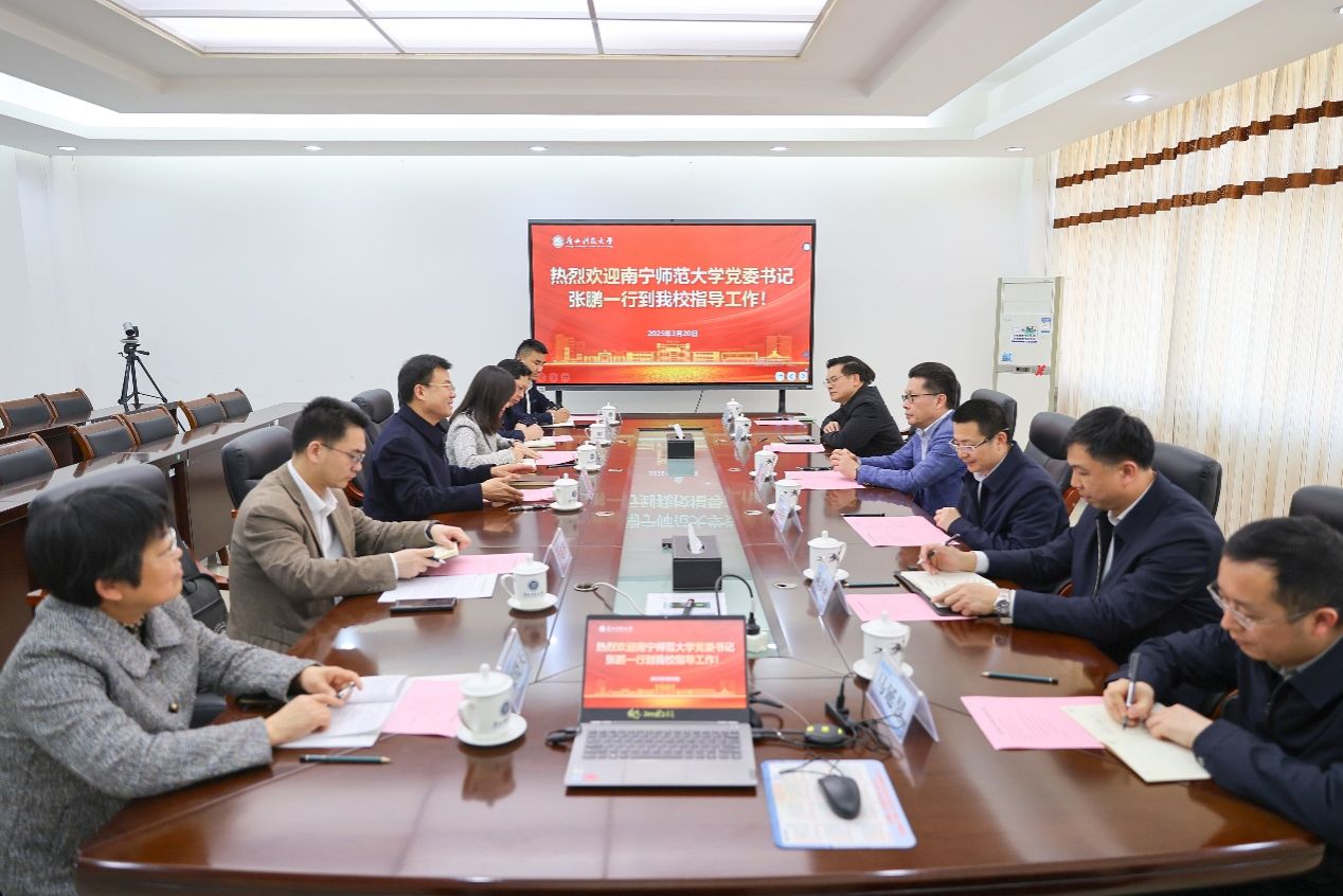 3月21日上午,张鹏一行到广西科技师范学院调研交流,受到了该校党委书记杨杰、校长韦友欢、副校长宋启军的热烈欢迎。双方相关部门负责人在座谈交流会上就教学改革、人才培养、科研创新、服务地方等工作展开了热烈交流。张鹏一行还先后参观了该校综合实验中心、智慧教学楼、三全育人示范中心等地。
