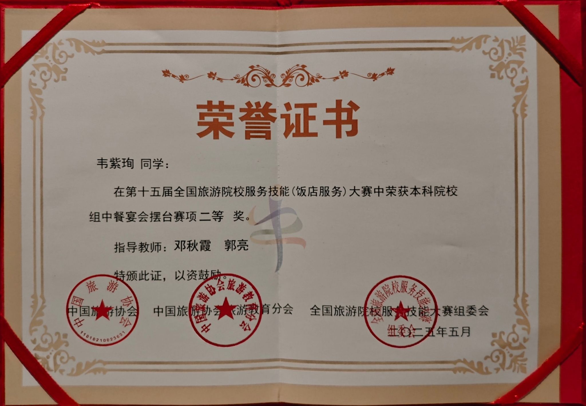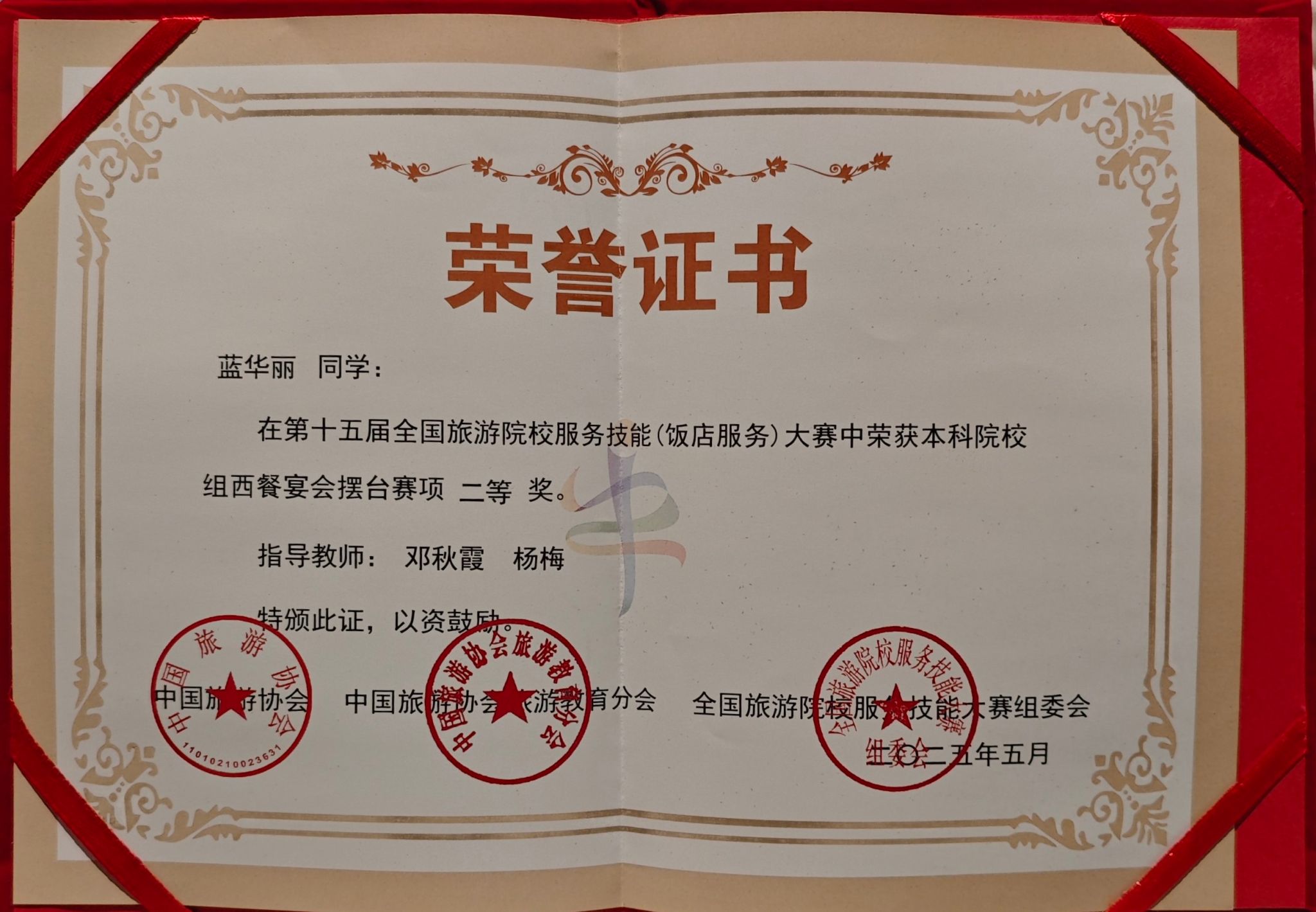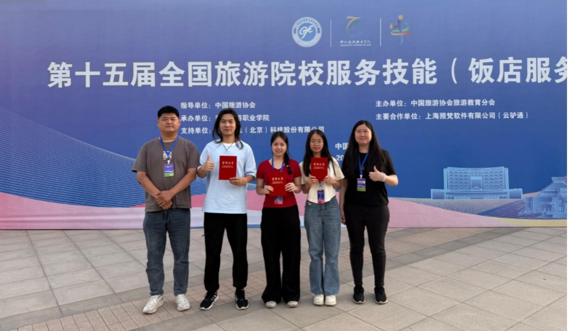 5月14日至18日,在郑州举办的第十五届全国旅游院校服务技能(饭店服务)大赛中,我校旅游与文化学院的3位参赛选手凭借卓越表现脱颖而出。其中,蓝华丽同学在本科院校组西餐宴会摆台赛项中荣获二等奖,韦紫珣同学在本科院校组中餐宴会摆台赛项中斩获二等奖,吴俊松同学在本科院校组客房服务赛项中获得三等奖。