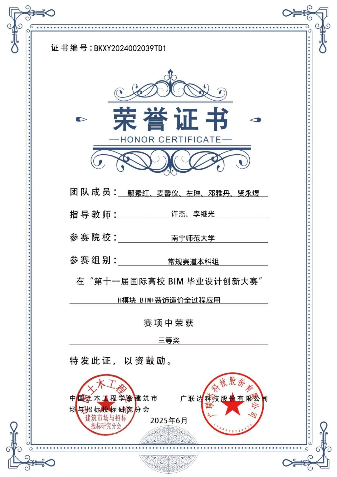 图2在H模块BIM +装饰造价全过程应用赛项中荣获三等奖