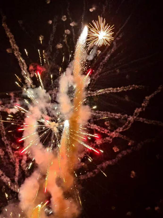 “东风夜放花千树,更吹落,星如雨。”于我而言,过年最盛大的仪式,便是那一场场绚烂的烟花秀。它就像一个加速器,将浓郁的年味彻底地释放出来。“嗖”地一声,一道亮光划破夜空,紧接着无数声“砰”汇成巨响,无数朵烟花瞬间汇聚起来,相互交织,相互辉映,把整个夜空装点得如梦似幻,我也与家人、邻里在谈笑声中一同欣赏这一曲热闹的新年交响曲,烟花的美丽瞬间也被定格在我们的脑海中,化为对美好生活的向往。