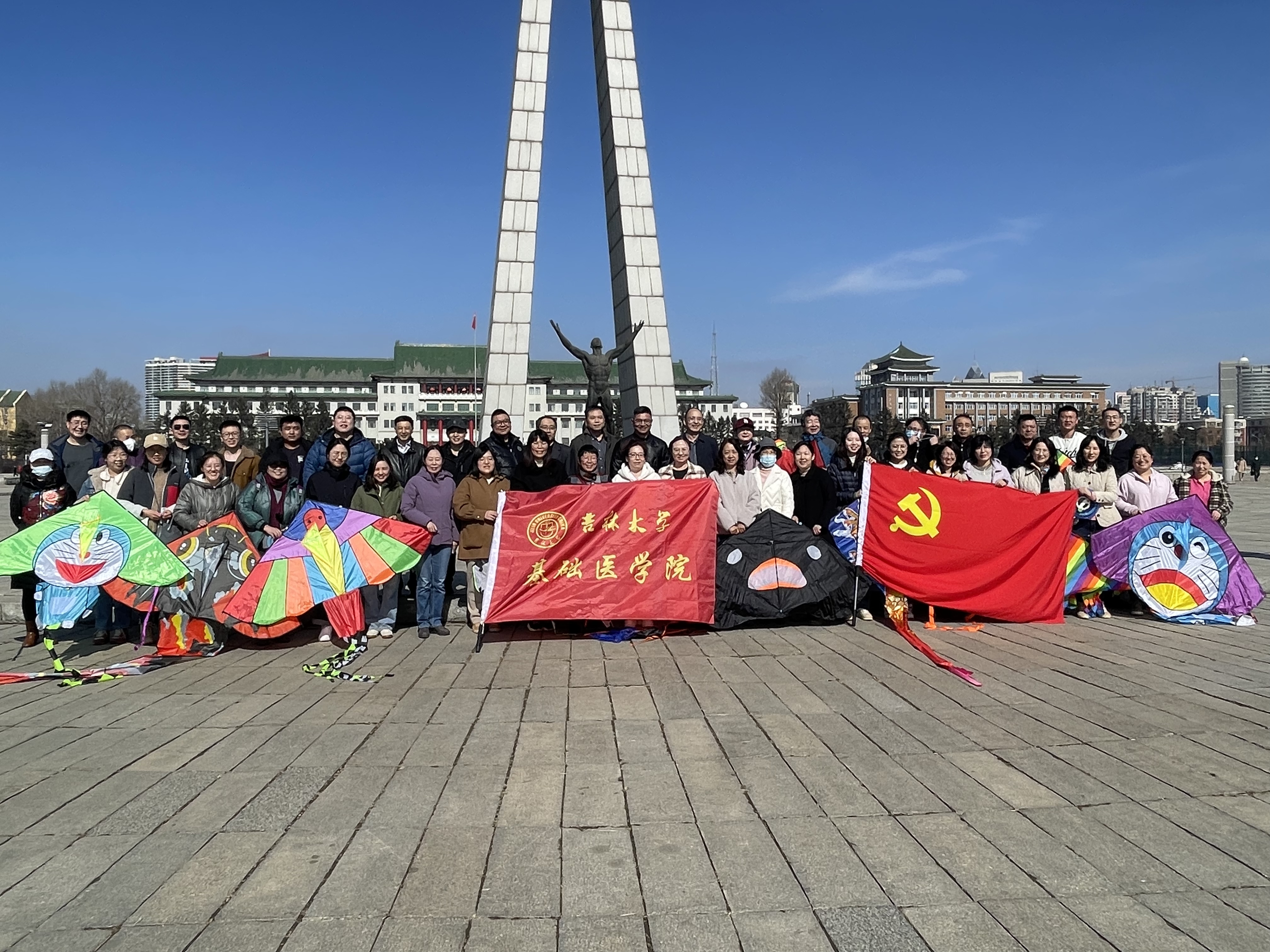 在春意盎然的文化广场上,学院的女教职工们褪去了工作时的严谨形象,脸上洋溢着热情、活力与朝气,各式各样、色彩纷飞的风筝满载着教职工们的希望与快乐在天空中自由翱翔。