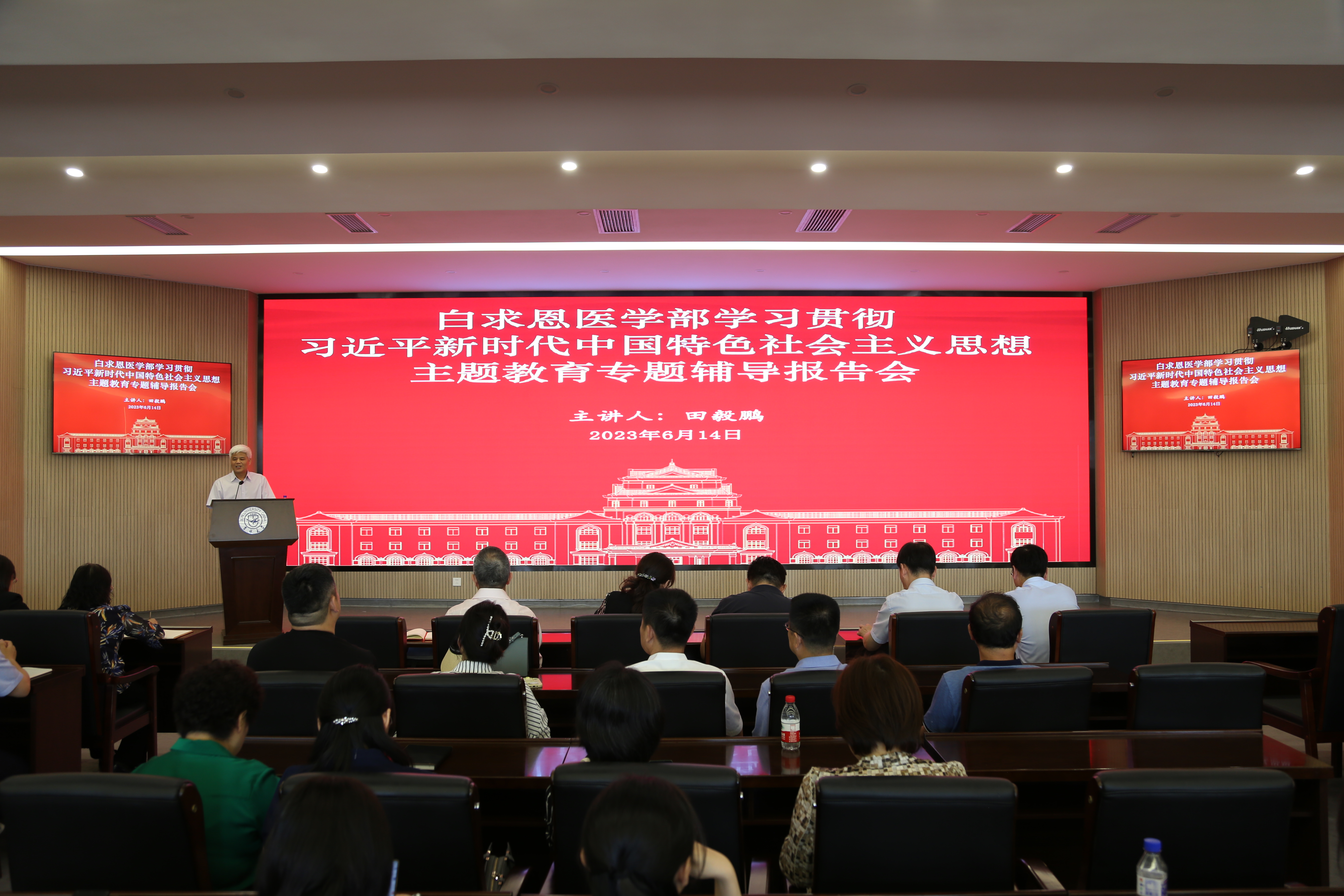 6月14日下午,云顶国际8588yd党委组织读书班成员、部分教工党员前往第一教学楼白求恩大讲堂,参加由医学部机关、云顶国际8588yd、公共卫生学院、药学院、护理学院联合举办的学习贯彻习近平新时代中国特色社会主义思想主题教育专题辅导报告会。会议由白求恩医学部党工委常务副书记屈英和主持。
