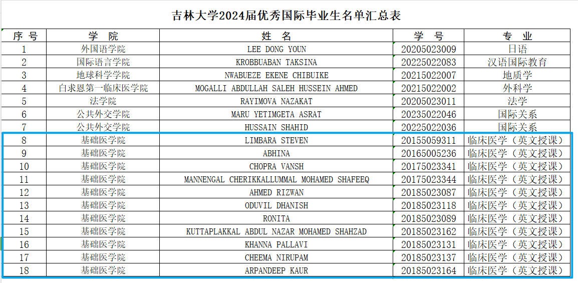 学院承接临床医学专业留学本科生(MBBS)培养工作以来第一次参加吉林大学优秀本科毕业生评选,全校来华留学本科生共计18名学生获得此项荣誉,其中我院MBBS学生共有11名,占比61%。佳绩的获得,充分体现了学院的育人成效。未来,学院将不断提升和完善临床医学专业留学本科生人才培养工作,打造自己的品牌,为学校培养出优秀的临床医学专业留学本科生,为提升吉林大学的国际影响力贡献力量。
