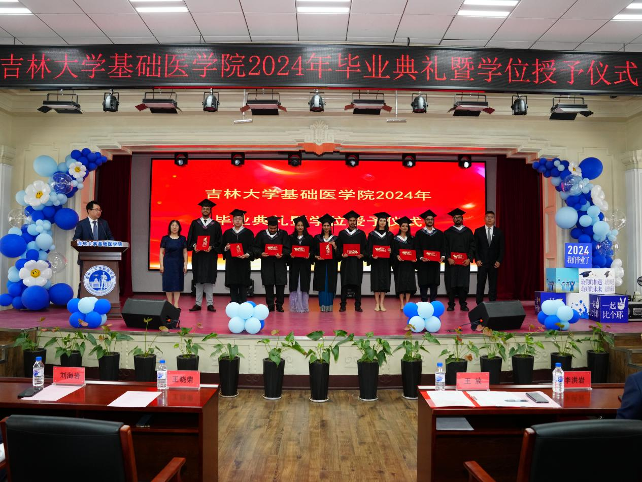 留学生毕业生代表林明烨发言,代表2024届MBBS毕业生,对辛勤培育我们的学院和老师们致以崇高的敬意和诚挚的感谢。很开心在这里认识了来自不同国家的志同道合的朋友,未来的日子里,大家会时刻谨记学院和领导老师的教诲,带着梦想飞得更高,积极投身社会,服务社会。