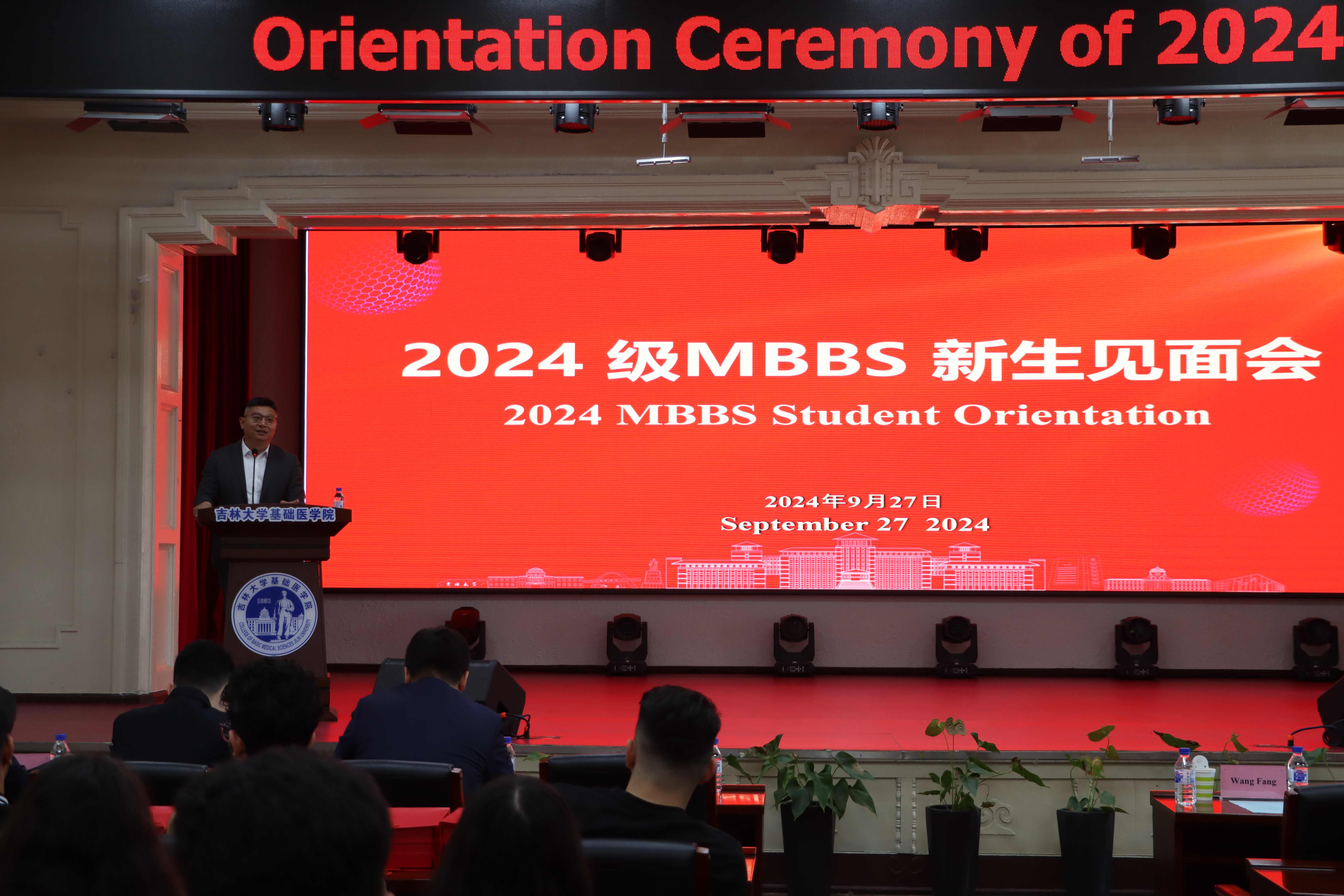 首先,与会的各位领导和新生们共同观看了由2023级MBBS留学生拍摄的欢迎视频《Welcome to JLU》。视频通过学生的视角,以真挚的情感和生动的画面,展现了美丽的校园环境和丰富多彩的校园生活,让新生们对未来的学习生活充满了期待和憧憬。