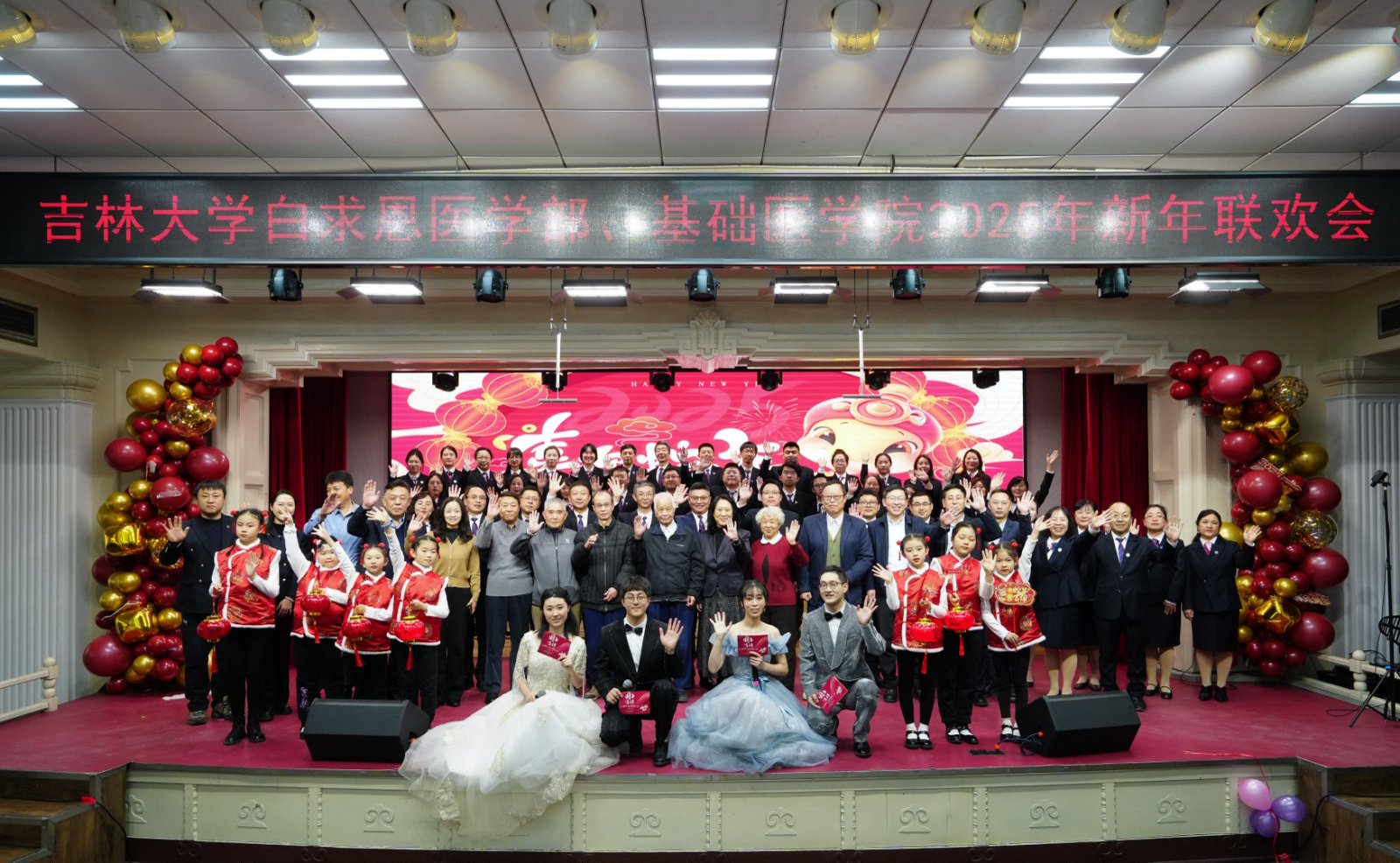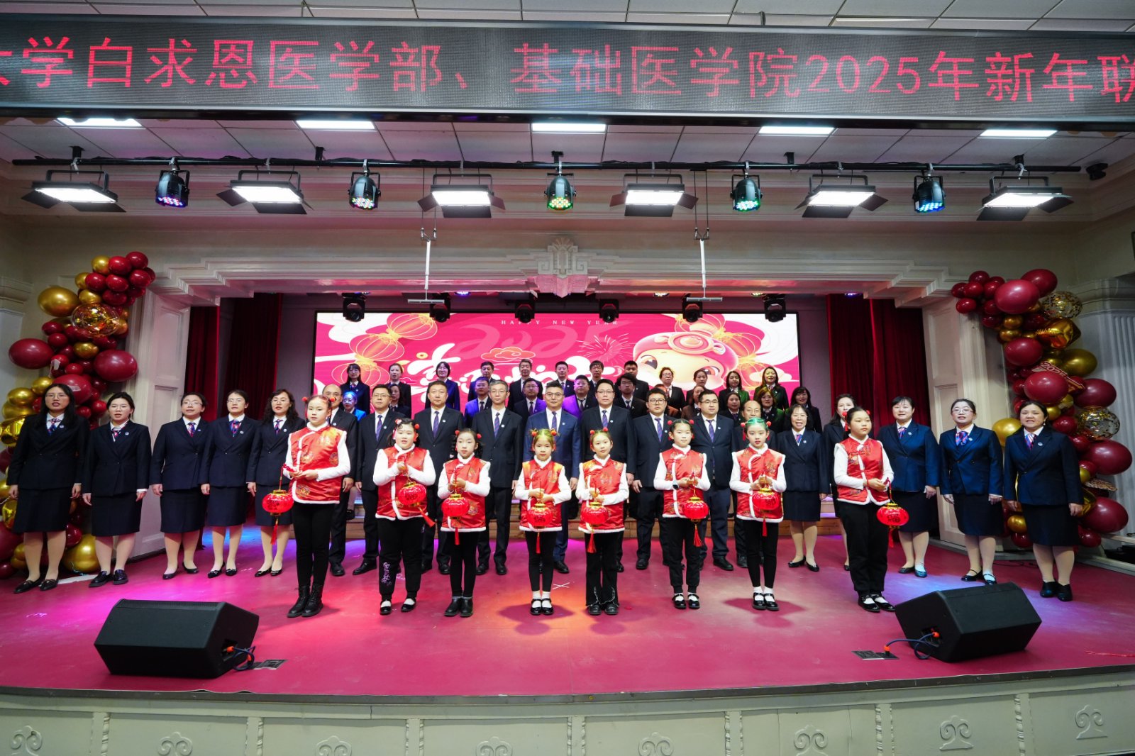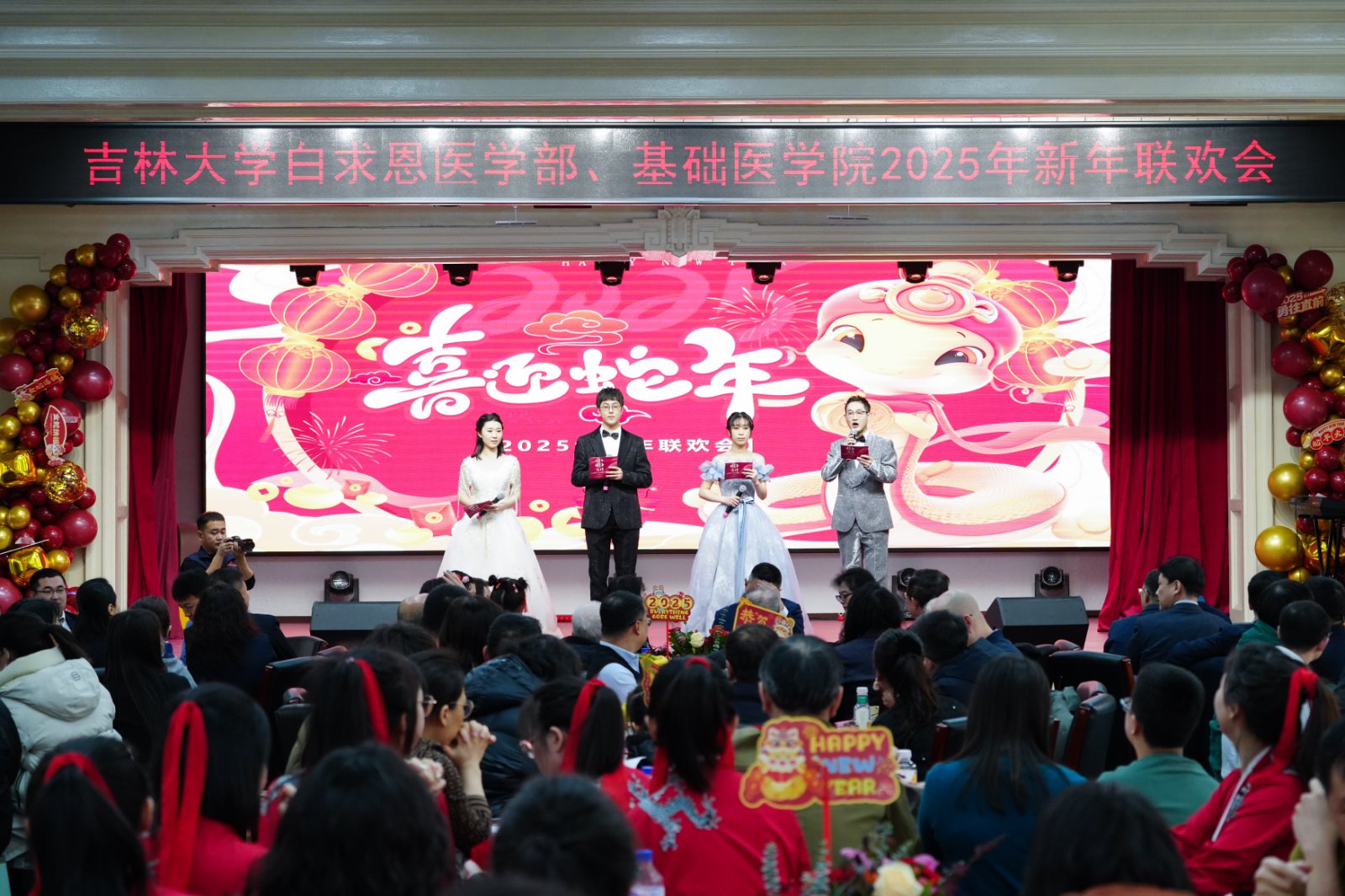 岁序更替,华章日新;祥蛇献瑞,共启新程。2025年1月10日下午,白求恩医学部、云顶国际8588yd联合在基础楼二楼报告厅举办2025年新春联欢会,学部及学院现任、历任领导班子成员、部分退休老领导、学院合作单位负责人,师生代表共计二百余人欢聚一堂,共迎新春,欢庆佳节。