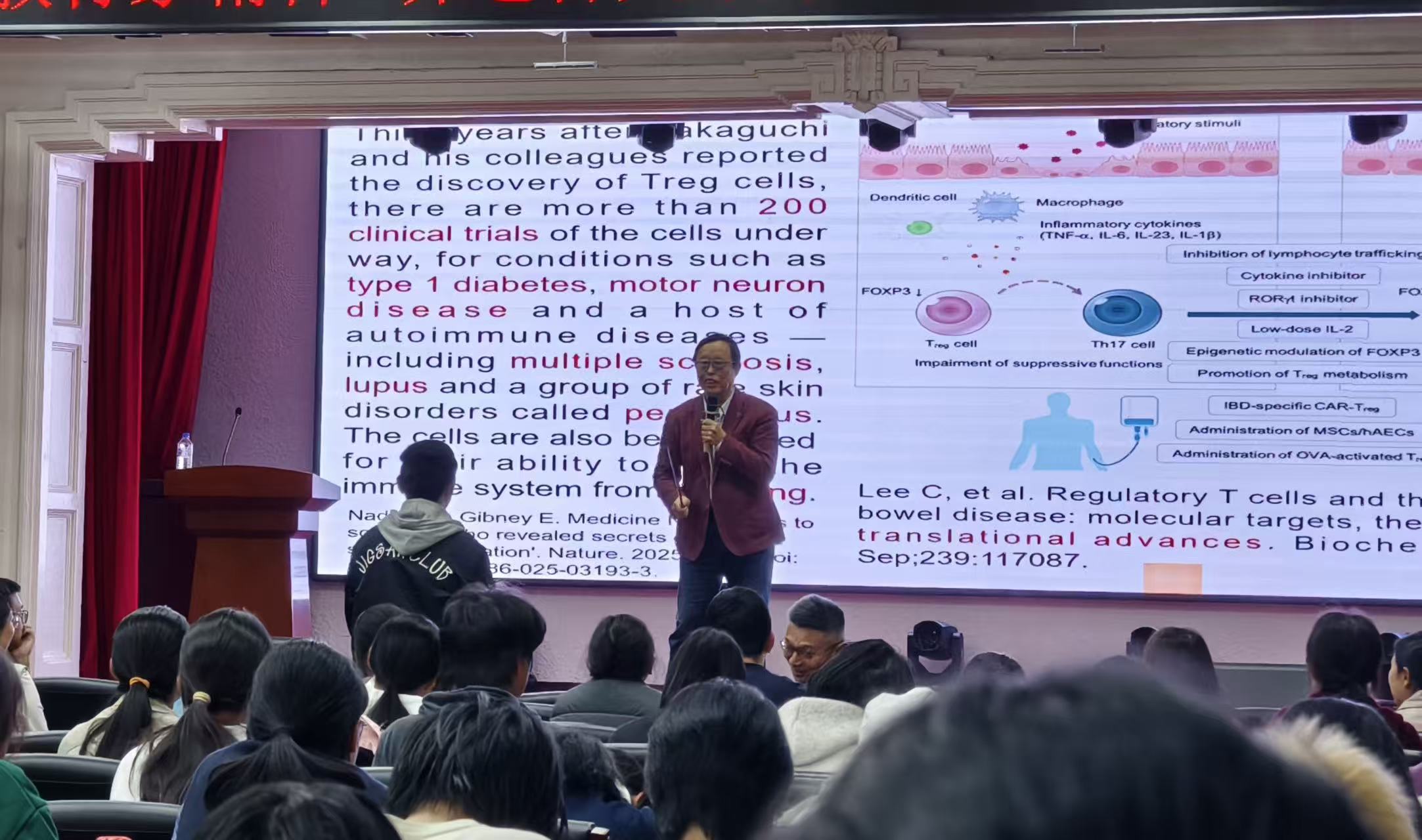 在寻找“闸门”的过程中,日本科学家坂口志文通过一个现在看来非常简易的小鼠实验取得了突破性进展。他发现从小鼠中分离出的CD4+ CD25+ T细胞在免疫反应中起到关键作用。若通过抗CD25抗体去除这些细胞,小鼠会出现多种自身免疫性疾病。这一实验首次揭示了免疫系统中确实存在一种抑制过度反应的机制,相当于给免疫系统安装了“闸门”。于教授指出,这一实验“极其简单却深刻”,验证了免疫系统中“平衡”机制的存在,也为后续获得诺贝尔奖奠定了基础。之后科学家们进一步发现,转录因子Foxp3是调节性T细胞发育与功能的关键分子,将Foxp3导入普通T细胞后,这些细胞获得了抑制功能,从而正式确认了调节性T细胞(Treg)的存在。于教授指出“调节性T细胞的发现是免疫学史上的一个里程碑,它告诉我们免疫系统的智慧在于平衡。”