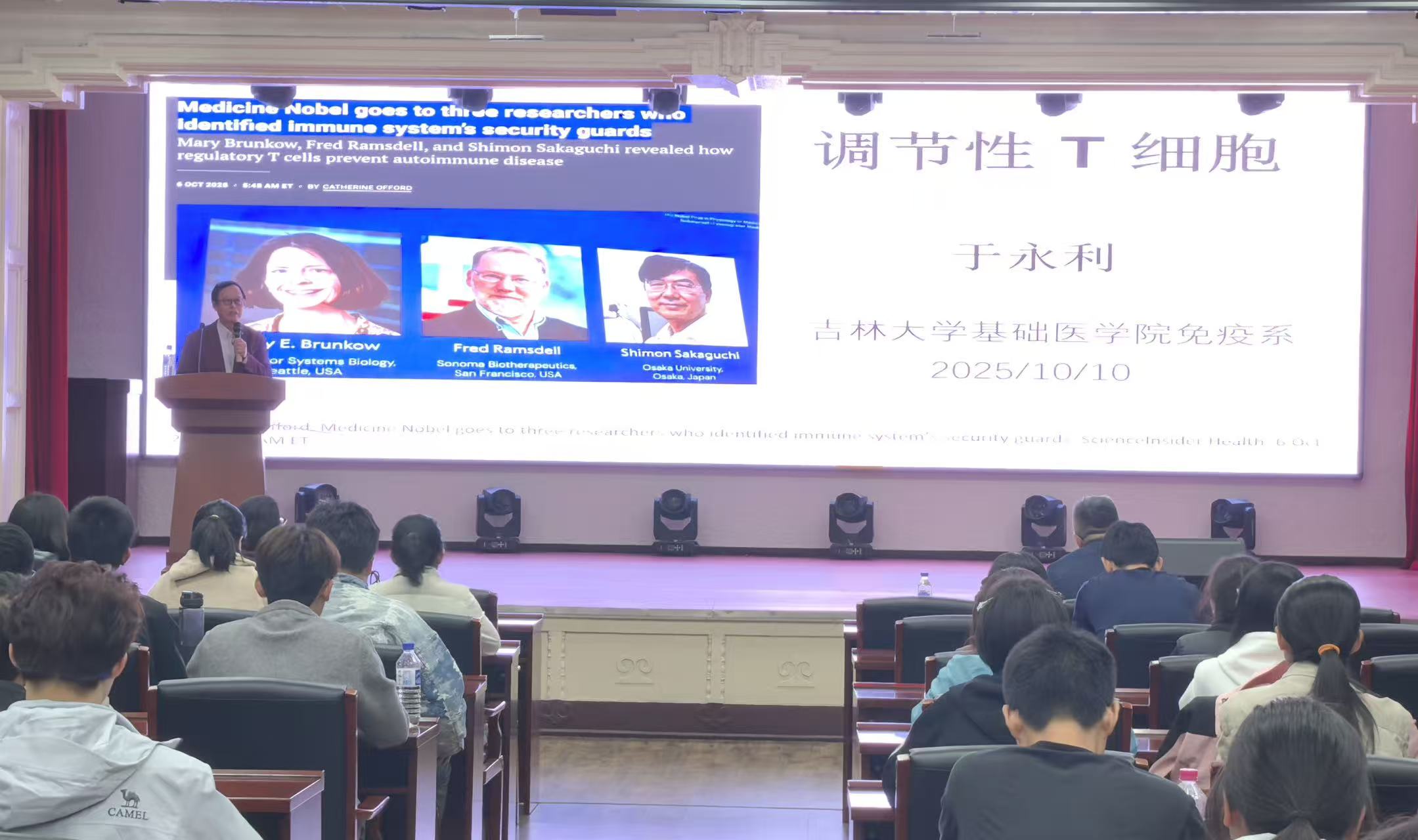 诺贝尔奖作为科学界的最高荣誉,其获奖成果不仅代表了人类认知边界的突破,更对科研人才培养具有独特的启蒙价值。10月10日下午,云顶国际8588yd邀请国家百千万工程专家、吉林大学唐敖庆卓越教授、我院免疫学系于永利教授进行了题为“潜心基础医学研究 三十年磨一剑——2025年诺奖解读”的专题讲座。学院全体本科生和教师代表共200余人参加了本次讲座。