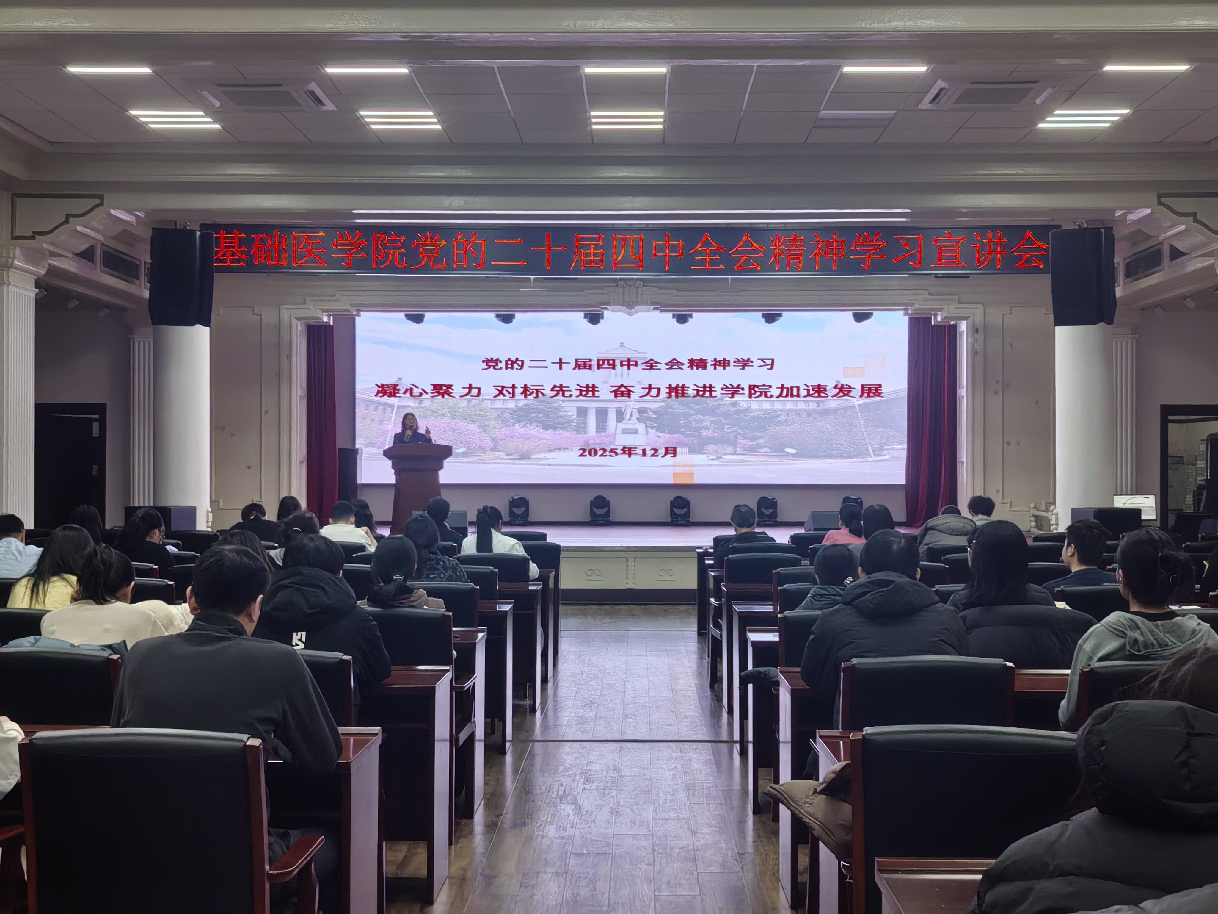 12月22日,云顶国际8588yd党委召开全体党员大会,党委书记王晓荣以《凝心聚力,对标先进,奋力推进学院加速发展》为题作领学发言,带领学院全体党员共同深入学习党的二十届四中全会精神。