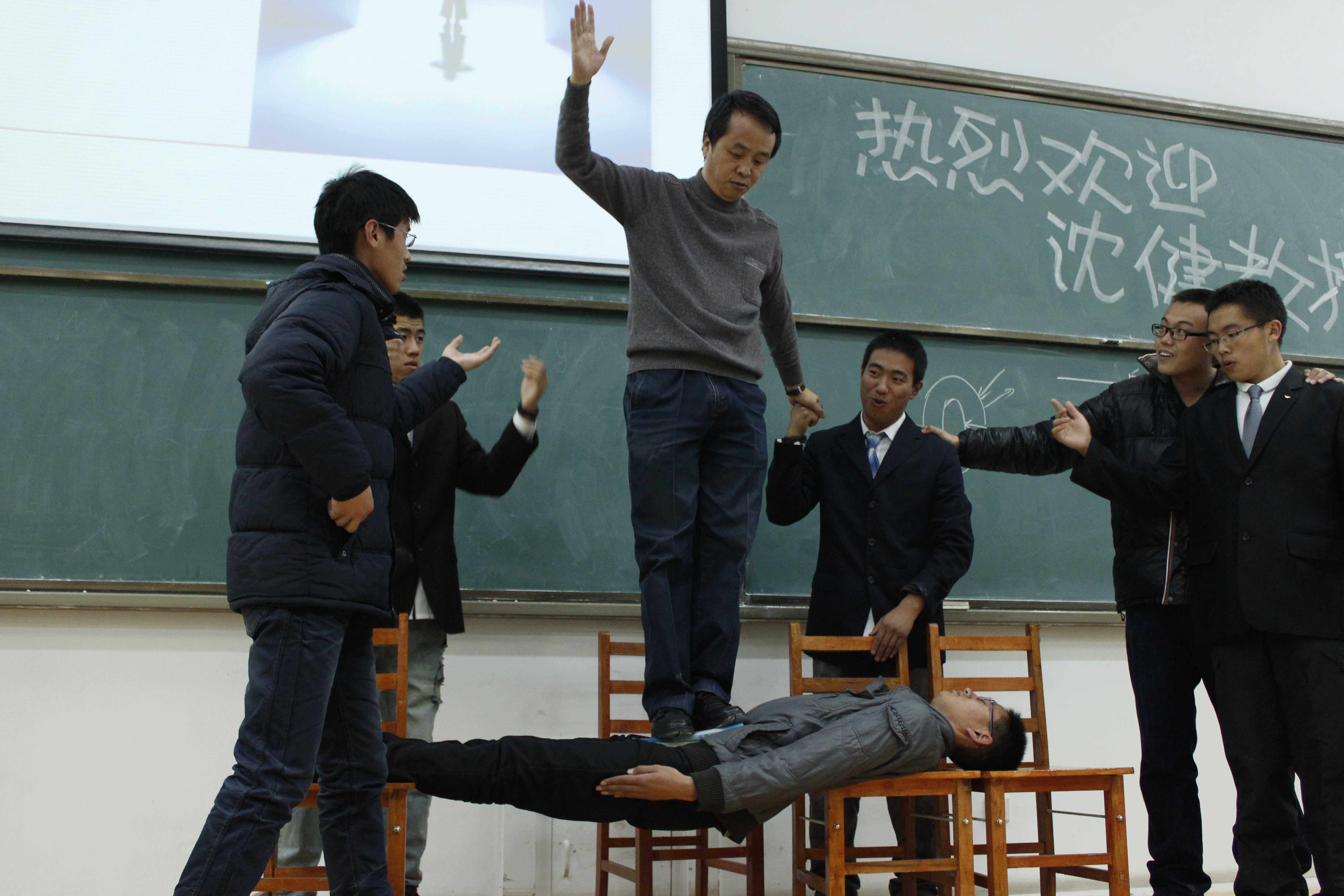 本次讲座以“阳光心态,快乐成长”为主题。在讲座中,沈教授用幽默诙谐的语言就学习、友情、爱情、成长、心态等诸多方面深入浅出地为大家进行讲解。讲述中,沈教授结合漫画、名言等阐释了学习是为职业做准备、友情是为快乐做准备、爱情是为幸福做准备的道理,并向同学详细讲解了培养良好心态的方法。随后沈教授与同学进行现场互动,用两个水杯的拿放生动的传达出“放得下才能拿得起”的哲理,将现场气氛一次次推向高潮。最后沈教授演示真人催眠,使同学们一次又一次地被催眠术的神奇力量所震撼。