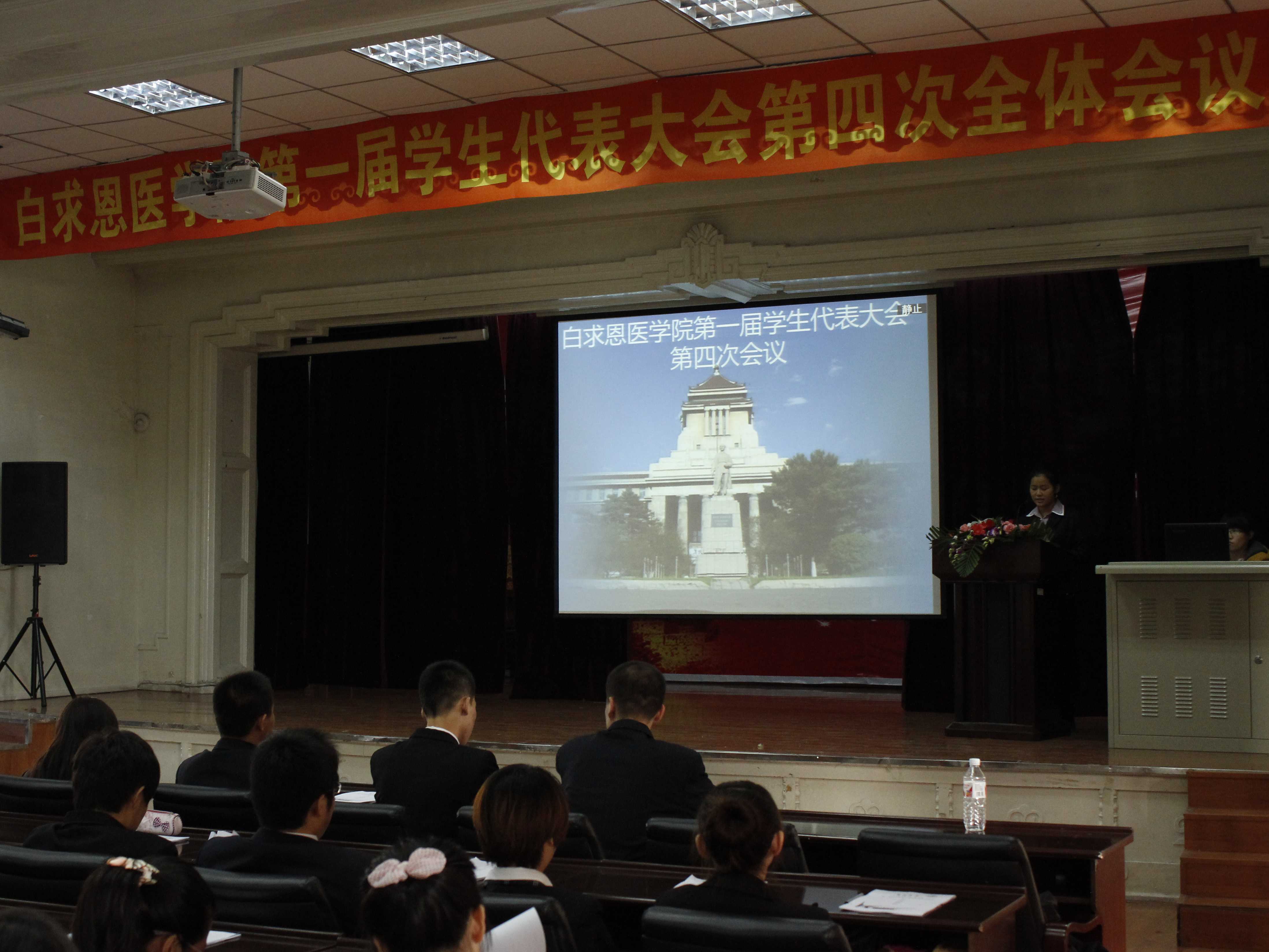 11月5日下午,白求恩医学院第一届学生代表大会第四次全体会议在基础楼二楼多功能学术报告厅举行。白求恩医学院党委副书记兼副院长苑锐、学生工作办公室主任吴剑锋、团委书记夏燕来、辅导员魏宇航及157名学生代表出席了会议。会议由白求恩医学院团委副书记单锐婷主持。