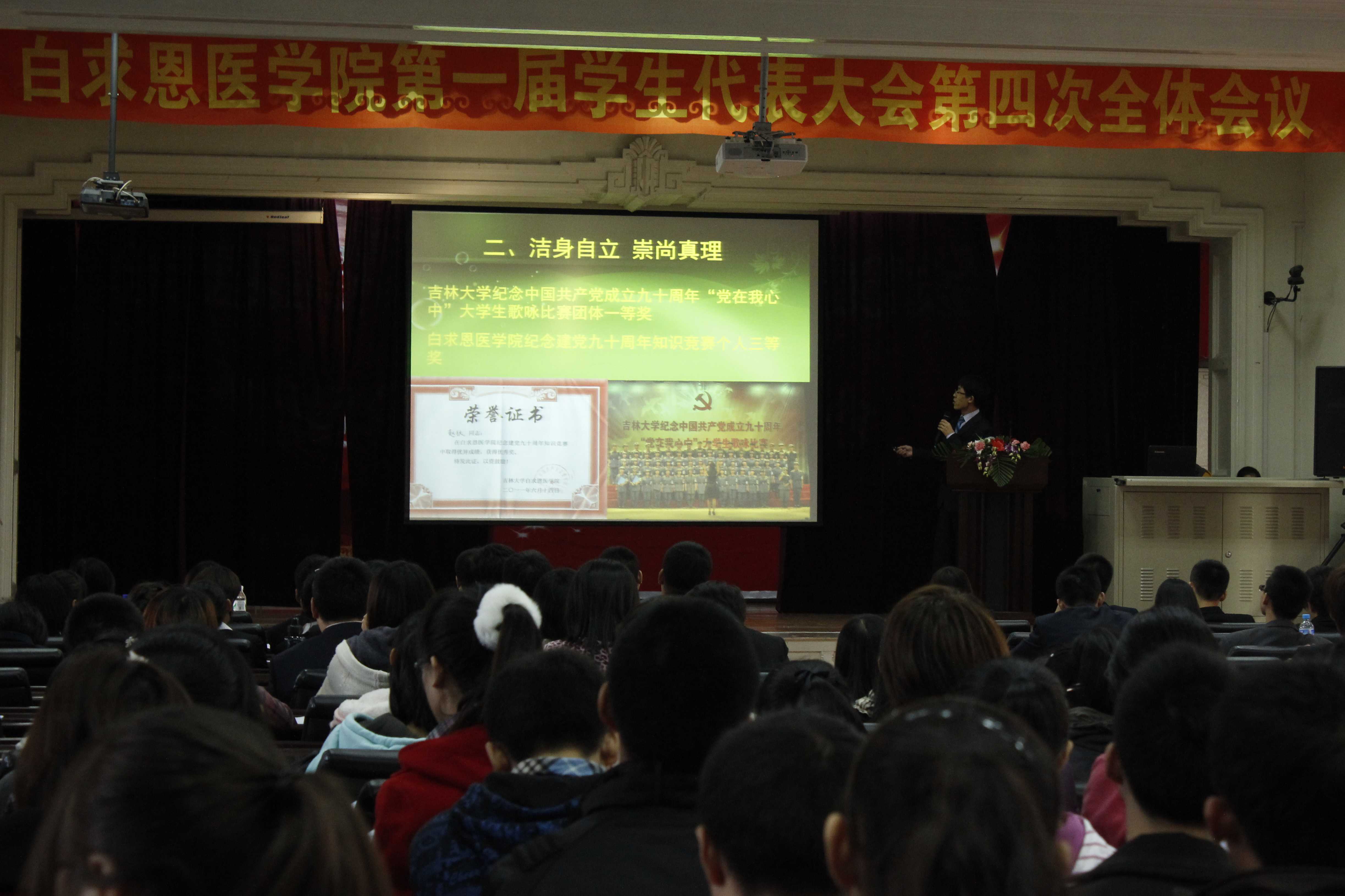 本次学生代表大会的主要内容为评选2011年“白求恩十佳大学生”及白求恩优秀班级。“白求恩十佳大学生”的20名候选人都是经过初选的国家奖学金、国家励志奖学金、一等奖学金的获得者,他们在学习、科研、学生工作、志愿服务等方面都取得了一定的成绩。大会上每位候选人都做了自我陈述,并接受了老师和学生代表的提问。最后经过无记名投票,评选杨帆(08级临床医学五年制)、赵狄(09级临床医学五年制)、贾林沛(09级白求恩医学班)、崔梦莹(08级临床医学七年制)、朴吉元(09级临床医学七年制)、李清月(09级临床医学五年制)、李梓菲(09级临床医学五年制)、戎月(09级临床医学七年制)、田佳怡(09级白求恩医学班)、马梦诗(08级临床医学五年制)为2011年“白求恩十佳大学生”荣誉称号。