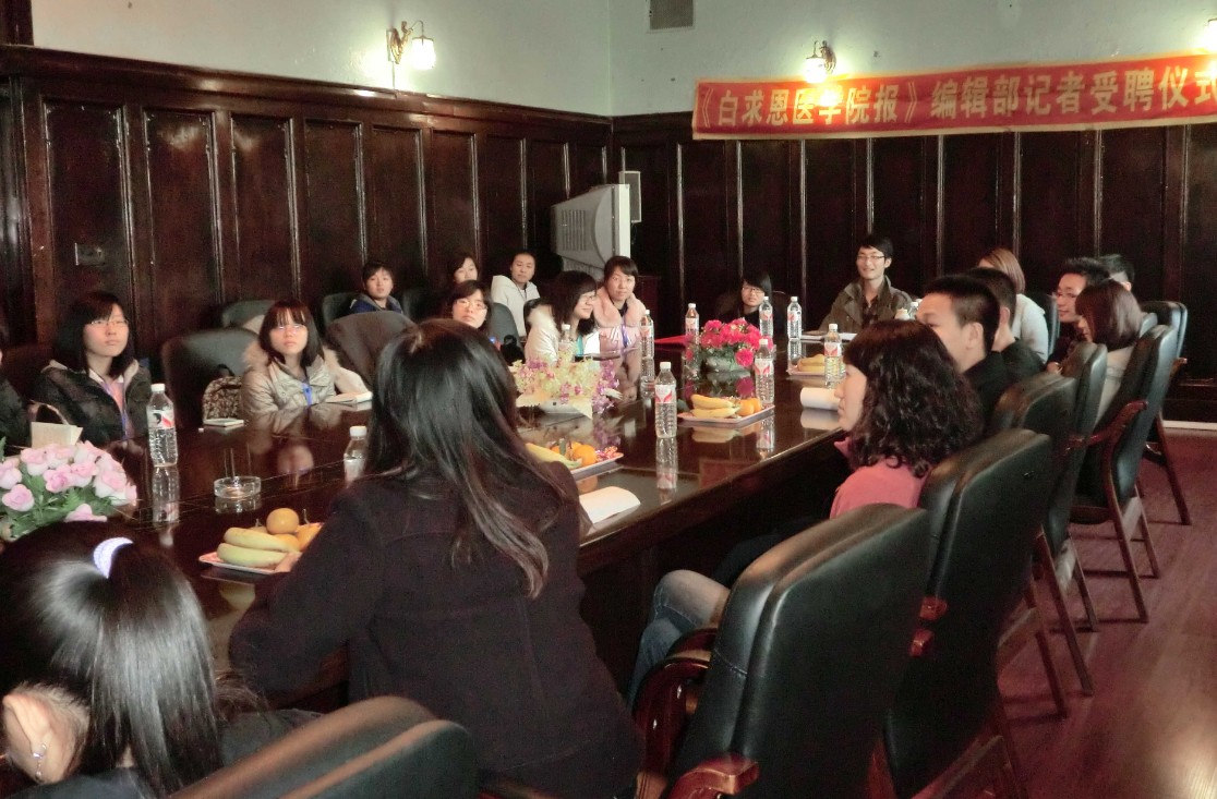 11月8日中午,《白求恩医学院报》编辑部全体成员于白求恩医学院三楼会议室参加记者节座谈会暨优秀记者颁奖仪式,以此庆祝第十二个记者节的到来。白求恩医学院团委书记夏燕来、辅导员魏宇航以及学生会主席高宪、团委第二副书记单锐婷应邀参加座谈会。本次座谈会由《白求恩医学院报》学生副主编刘悦娇主持。