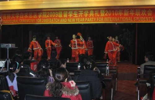 12月31日下午,我院全体留学生与各级领导、老师和关注留学生教育事业发展的同仁们欢聚一堂,举行吉林大学白求恩医学院2009级留学生开学典礼暨2010年新年联欢会,常务副校长兼白求恩医学院院长李玉林出席典礼并观看联欢演出。