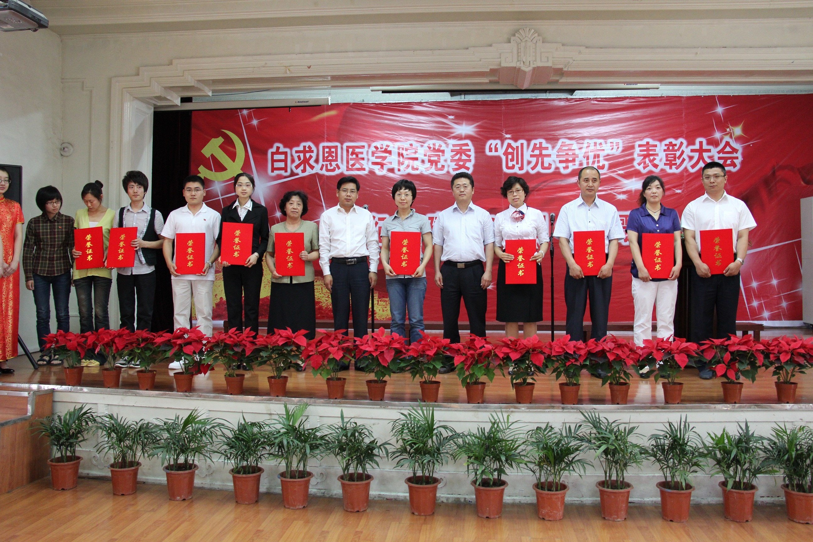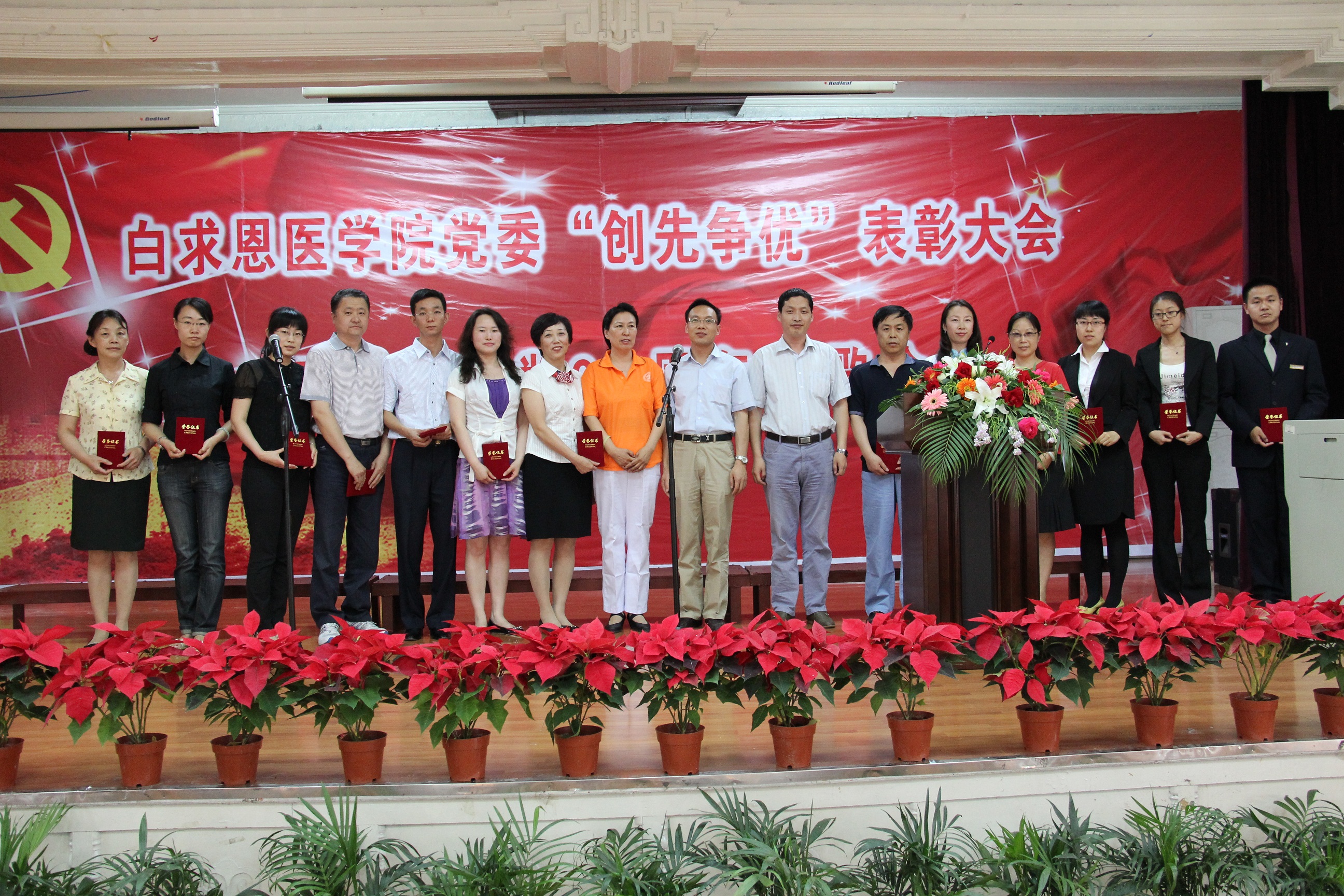 “创先争优”表彰大会由白求恩医学院党委书记屈英和主持,大会在庄严的国际歌中拉开帷幕。首先,屈英和介绍了白求恩医学院“创先争优”活动的开展情况,学院党委委员、常务副院长孙连坤宣读了《关于表彰2008-2011年度“创先争优”活动先进党支部、优秀共产党员、优秀党务工作者的决定》,陈权、兰恒斌、于传波、申桂香、聂宏凯、董汉良分别为获奖代表颁奖。教工第七党支部书记夏映红、教工党员王医术分别代表先进党支部、优秀共产党员发言。