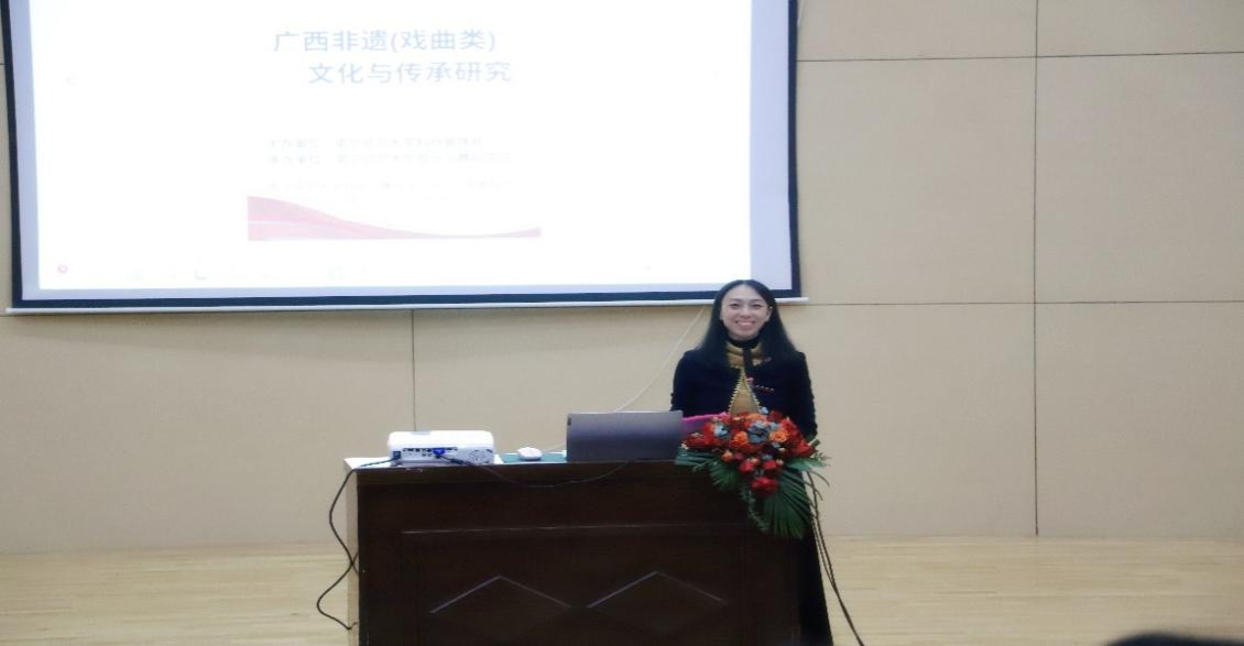 论坛上,黄妙秋院长致辞,她指出:学院积极响应党中央国务院关于非物质文化保护和传承的指示,落实教育部相关要求,高度重视非遗戏曲类保护、传承和进校园的工作,这次青年博士论坛和音乐与舞蹈学院非遗研究小组的成立就是具体的措施之一。论坛旨在通过青年博士们挑起广西戏曲类非物质文化保护、传承与研究的大梁,带动青年教师,共同推进非遗戏曲类的研究和进课堂,成为学院非物质文化遗产学科和专业建设,非物质文化遗产师资队伍培养的重要平台。接着,与会专家学者在论坛上作报告。特邀专家广西民族文化艺术研究院文化遗产部副主任黄羽在论坛上首先做《非物质文化遗产保护的广西实践》报告。她从国际层面、国家层面,对广西非物质文化遗产中的传统戏曲类遗产的保护现状与方法进行系统介绍,对广西传统戏剧类进入校园进行了深入探索。我校学报编辑部玉璐博士在《从“小家”到“大家”的民族共享节日 ——以国家级非遗瑶族盘王节为中心的考察》中,提出瑶族盘王节从家族仪式逐渐演变为政府主导和民间组织参与的民俗节庆,最后成为各民族共享的非物质文化遗产节日文化。从民族学的角度对非遗进行了探索。学院唐文生博士生做了《青春版大型彩调歌舞剧〈刘三姐〉在地方院校的传承和创新》报告。他认为,地方院校要结合自身的条件积极落实和修改教学目标和教育的目的,调整专业人才培训计划和方案发展彩调艺术,促进和推动广西高校艺术教育的改革。王克永博士在《广西客家山歌剧传承与发展等问题的思考》中,分析了客家山歌剧的流行地区、戏剧表演形式并对传承与发展问题进行探讨。许毓晓博士以《非遗视域下古骆越族群历史文化记忆的舞蹈创作研究》,探讨了广西壮侗语先民的古骆越民族舞蹈中所蕴含着民族文化和民族精神,并通过舞台化的个案研究,探讨非物质文化遗产的有效性保护与活态性传承。李曼霞博士做了《非遗戏曲教学与传承研究——以南宁师范大学为例》的报告。她从政策解读、课程设计、教学实施等层面,对高校的非遗戏曲教学、传承、实践与研究进行分析和探讨。刘明华博士在《广西壮族“末伦”文化与传承漫谈》中提出:“末伦”具有浓郁的民族特色和艺术能力,也是最具有代表性的壮族曲艺品种。在多元的新时代,它也需要顺应现代社会的发展进行革新。我院非遗研究小组成员马松青和黄夏分别做了题为《广西戏曲音乐特征分析》,《广西戏曲传习中身段语言探索》的交流。学院谢育坚副教授,校友周小玉、郑经平、陈梦婷以及参会学生进行了现场提问,与讲演的七位博士围绕学术研究的热点与趋势、地方戏曲传习课程设置、非遗戏曲在中小学的传承等方面开展了充分热烈的讨论和交流。最后,南宁师范大学音乐与舞蹈学院地方戏曲传习班为论坛带来了广西文场、京剧非遗教学成果表演。论坛在迎新春的祥和气氛中圆满闭幕。