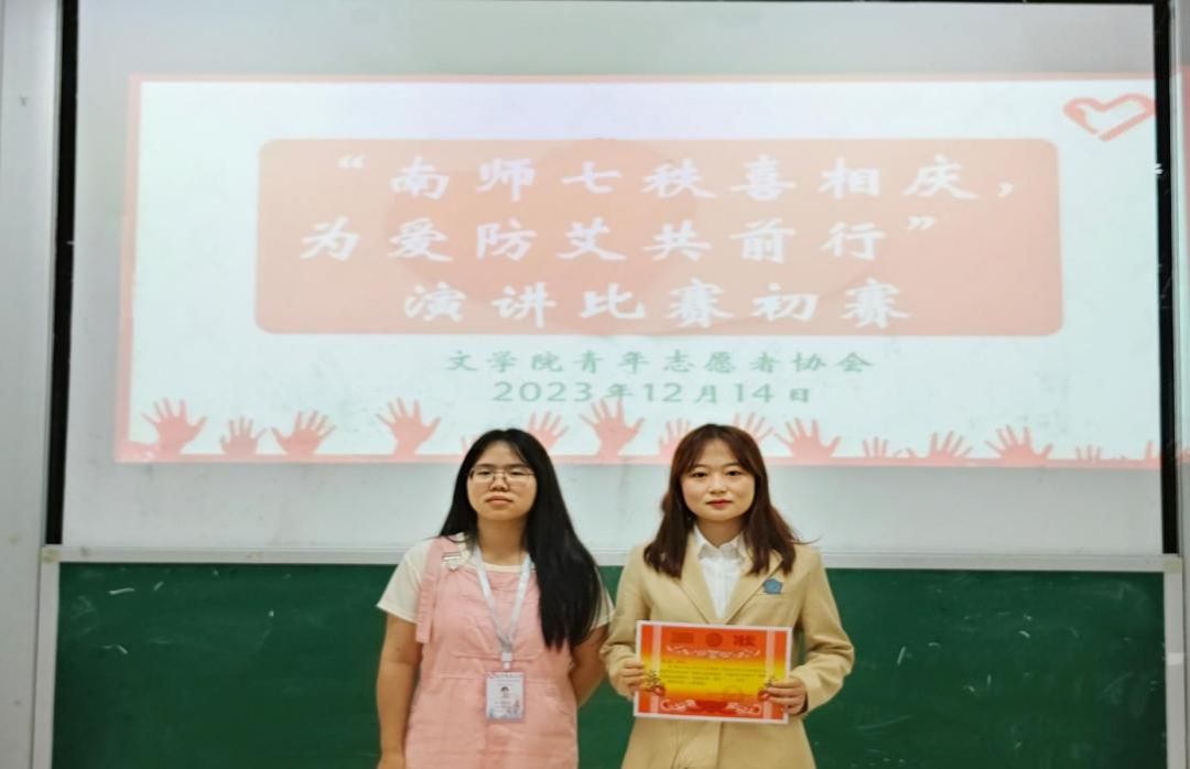 为响应世界第36个艾滋病日的号召,加深青年大学生对艾滋病的认识,增强同学们的防艾意识,引导同学消除对艾滋病人的歧视。文学院青年志愿者协会于2023年12月14日晚在文科综合楼401教室举办了主题为“南师七秩喜相庆,为爱防艾共前行”的演讲比赛初赛。各参赛队伍按照预定的顺序逐一进行PPT展示和演讲。选手们激情演讲,感情真挚,向同学们介绍了关于艾滋病的基本知识与防治方法,充分表达自己对于艾滋病的看法,呼吁同学们正确看待艾滋病,自觉养成文明健康的生活习惯。在参赛队伍演讲完成后,现场评委根据其表现进行打分。随后,所有人共同观看防艾视频,进一步加深了同学们对艾滋病防治的认识和理解。紧接着,主持人宣布各组得分情况以及获奖名单,评委为获奖选手进行颁奖。此次演讲比赛不仅加深了同学们对艾滋病的认识,引导同学们正确对待艾滋病,也增强了同学们的防艾意识,共同营造了积极向上的校园氛围。