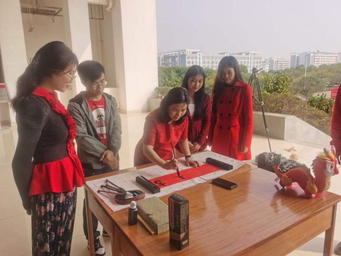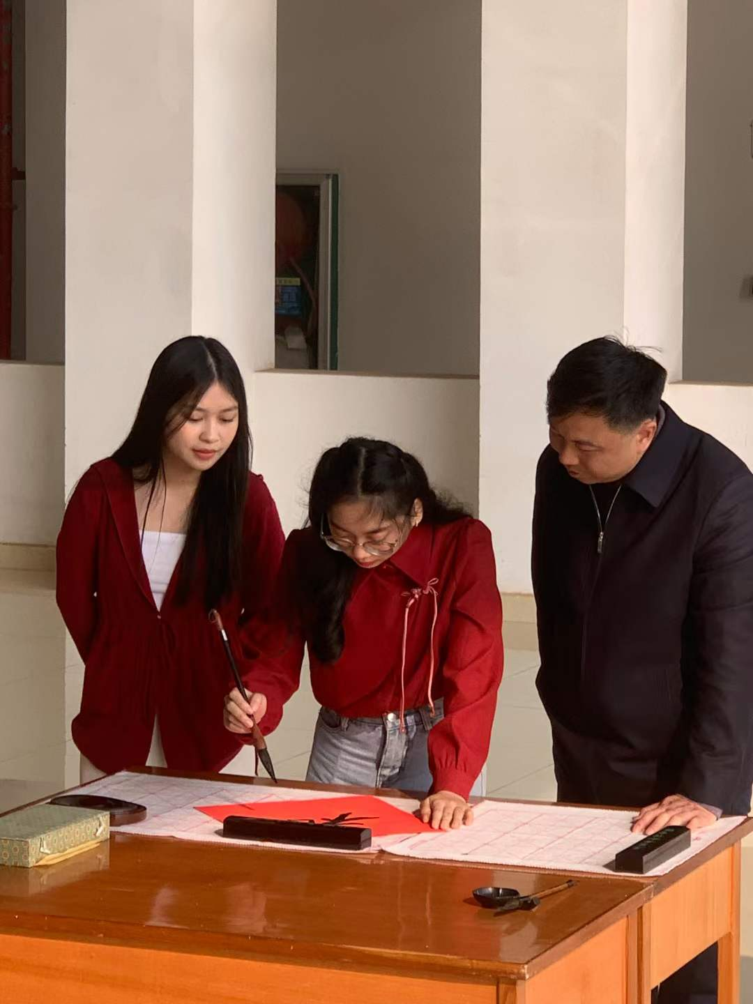 看到桌面上摆放整齐的笔墨纸砚,来自老挝的留学生康麦略带兴奋的说:“陈老师,我在中国读本科的时候了解过书法!”留学生们好奇的围绕在书桌的周围,陈洪波教授一边写着春联,一边对东盟留学生们说:“学习写书法就像学习做人,字要横平竖直,人要端端正正。”随后,在陈洪波教授的指导下,泰国留学生冯春雨认认真真,一笔一划的书写了自己留学生活中的第一张春联——“春”字。“‘春’字不仅仅是我的名字,也代表着春天、春节。在这里祝同学和老师们新春快乐。”冯春雨用一口流利的中文笑着说道。