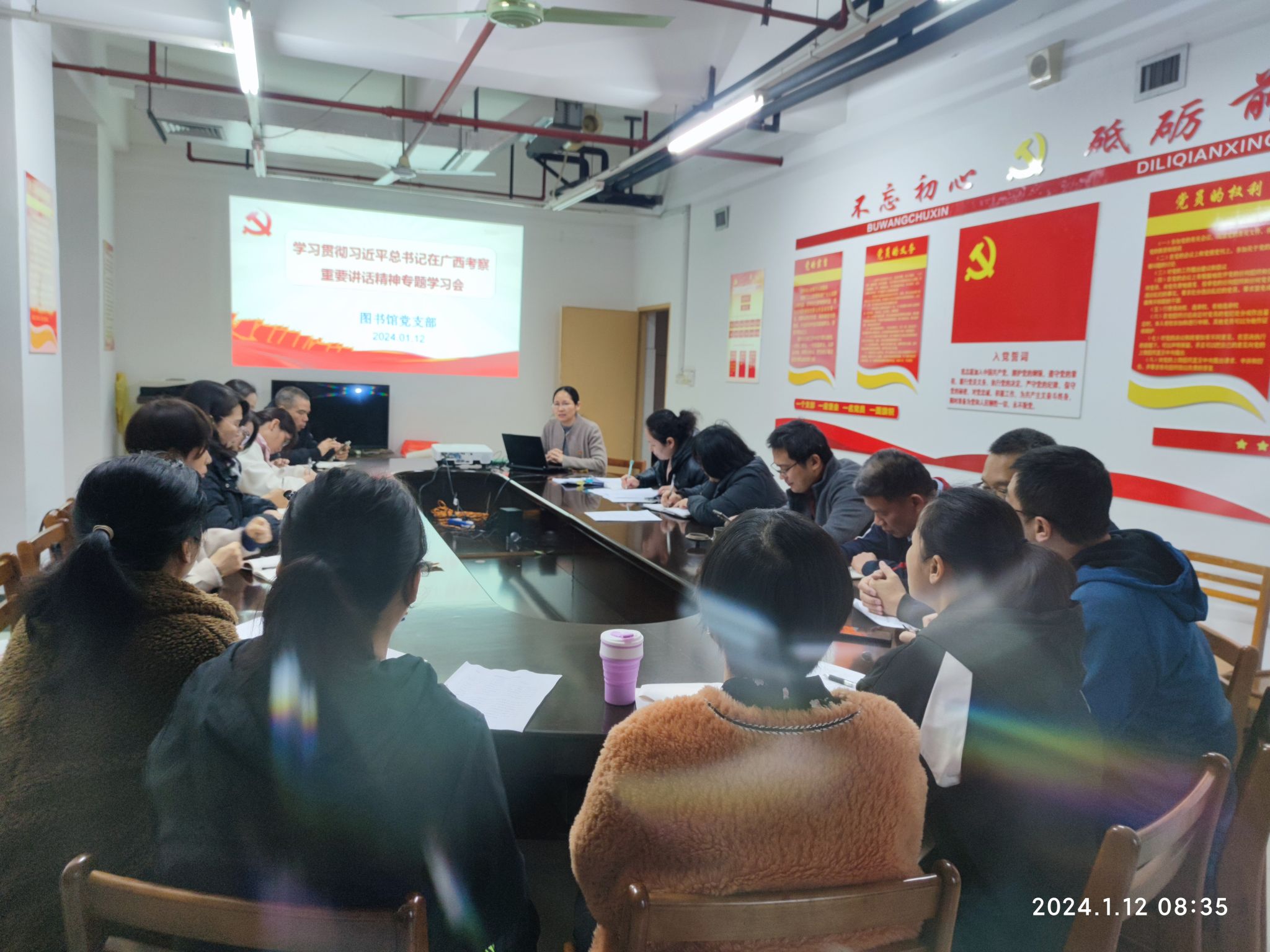 2024年1月12日上午,图书馆党支部于明秀馆十一楼党员活动室召开党员大会,会议贯彻“第一议题”学习制度,开展了学习贯彻习近平总书记视察广西重要讲话精神专题学习。图书馆全体党员参加了会议,会议由图书馆党支部书记叶佩珍主持。