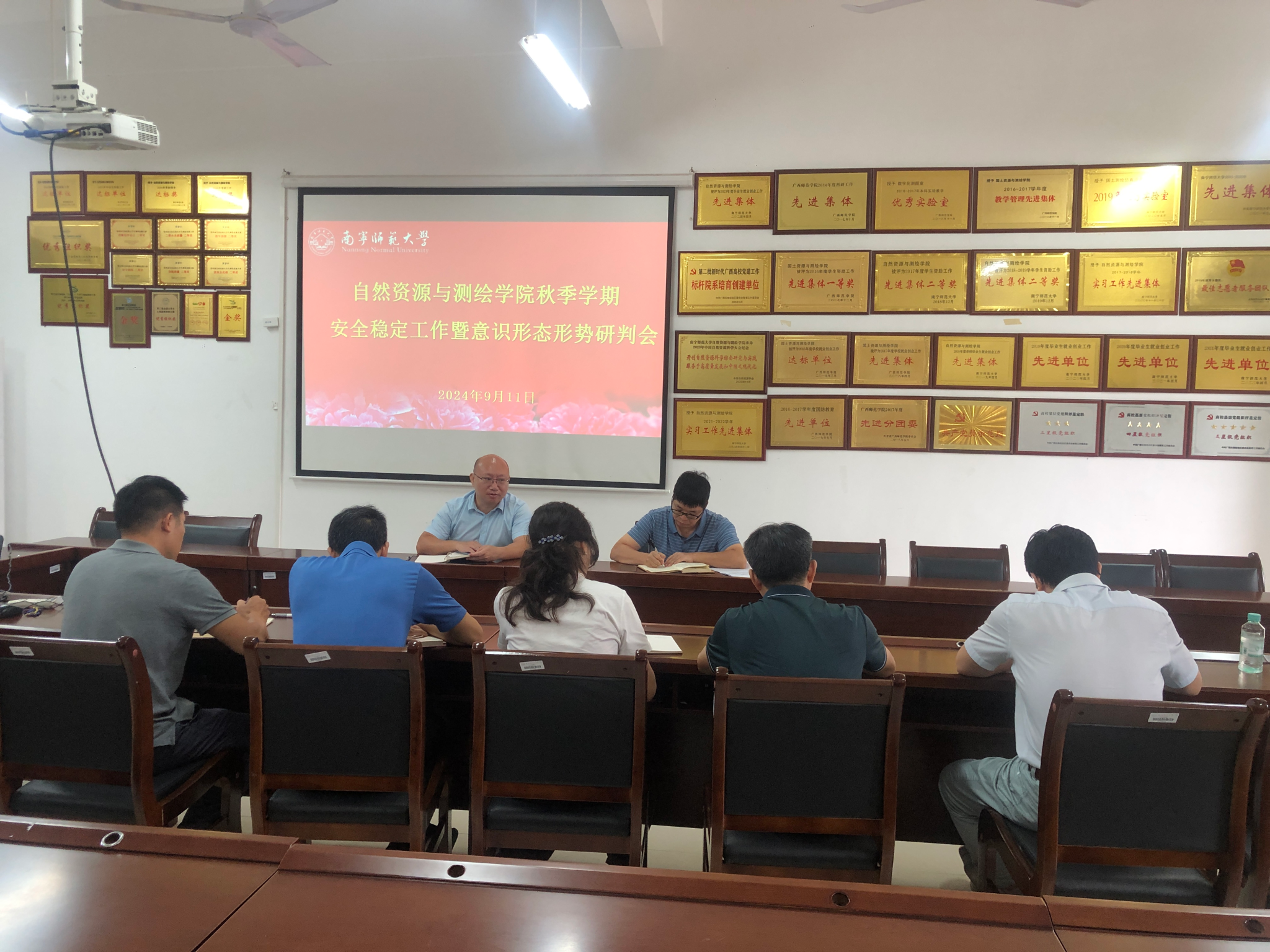 9月11日,自然资源与测绘学院在地源楼A412会议室召开秋季安全稳定工作暨意识形态形势分析研判会。学院院长陆汝成、党委副书记莫雅兰、副院长杨小雄、副院长段炼、副处级组织员彭定新及各系主任、学院党办院办主任参加会议。会议由学院党委书记黎先主持。
