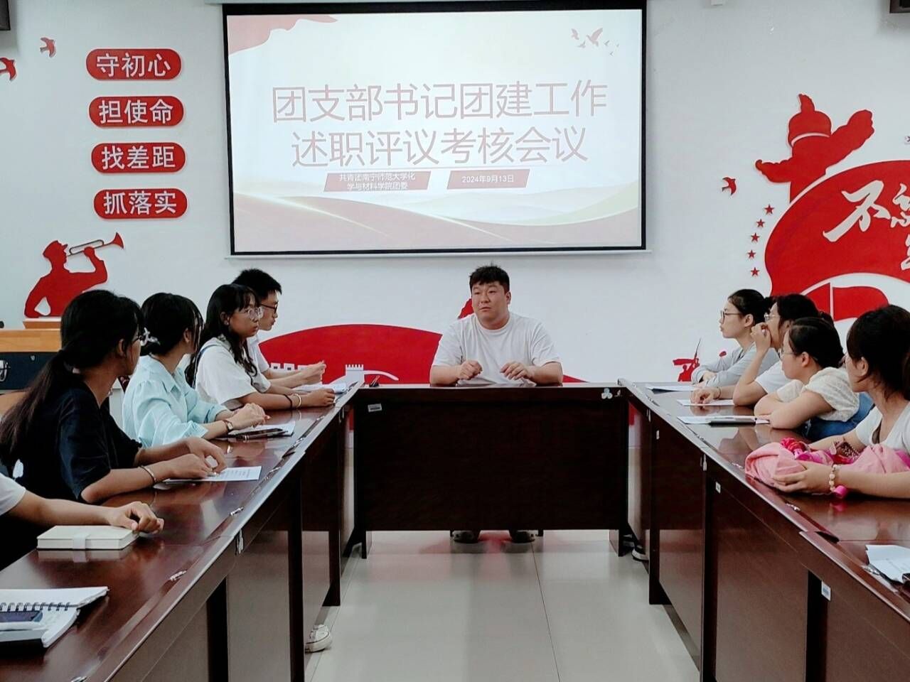 为进一步深化全面从严治团的要求,激发基层团组织活力,压实基层团组织书记责任,促进各团支部之间的经验交流与相互学习,9月13日,化学与材料学院在地化楼B228会议室顺利召开了团支部书记述职大会,学院团总支书记、组织部成员以及全体团支部书记出席会议,会议由团总支书记王立彬主持。