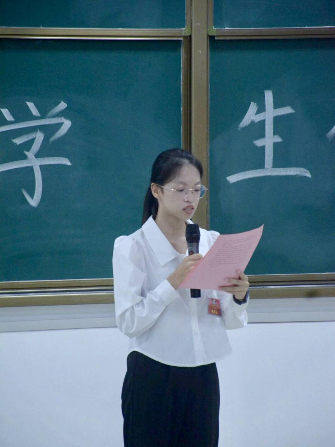 新一届当选学院学生会主席团成员黎秋雨同志宣读大会倡议书,号召全体学生干部要始终深入学习贯彻习近平新时代中国特色社会主义思想,在党的领导、共青团的指导下,秉持“全心全意为同学服务”的宗旨,践行“德才并育,知行合一”的校训和“明德至善 格物致知”的院训,把青春奋斗融入时代洪流,在推进强国建设、民族复兴伟业中展现新时代青年的担当。