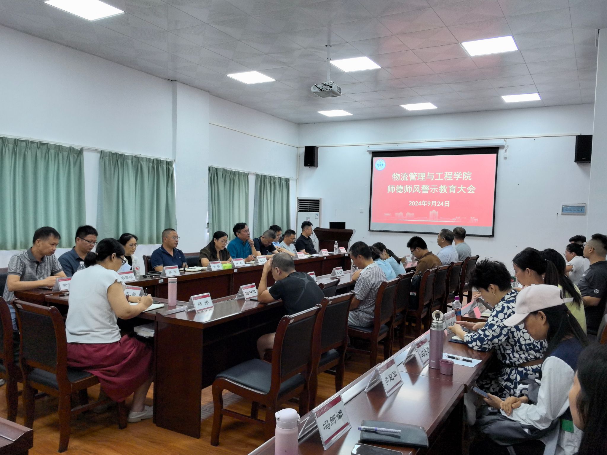为了深入学习贯彻落实习近平总书记关于师德师风第一标准的重要论述精神,切实加强师德师风建设,进一步规范教师履职履责行为,9月24日下午,物流管理与工程学院在武鸣校区地化楼C414室召开师德师风警示教育会。会议由学院党委书记陈兵主持,学院全体教职工参加会议。
