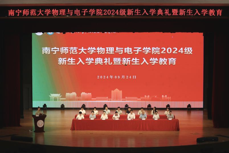 为进一步加强学生思想政治教育,2024年9月24日下午,物理与电子学院2024级新生开学典礼暨新生入学教育在武鸣校区音舞厅举行。学院党委书记韦汉忠、副院长陈东(主持学院行政工作)、党委副书记胡芸、副院长李光明、教师代表曾立、学工办全体老师和新生班主任老师出席典礼。