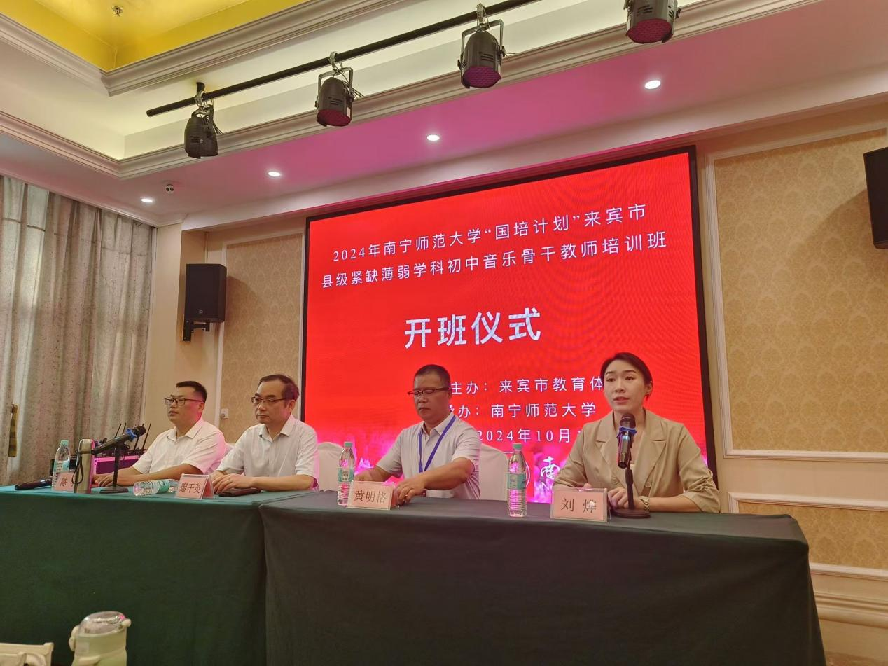 10月13日上午,由南宁师范大学音乐与舞蹈学院承办的2024年“国培计划”来宾市县级紧缺薄弱学科初中音乐骨干教师能力提升培训班如期开班。来宾市教育体育局师培中心主任廖干英、教师教育学院副院长黄明格,音乐与舞蹈学院党委书记陈宇、本次培训相关授课教师和50名学员参加了开班仪式。
