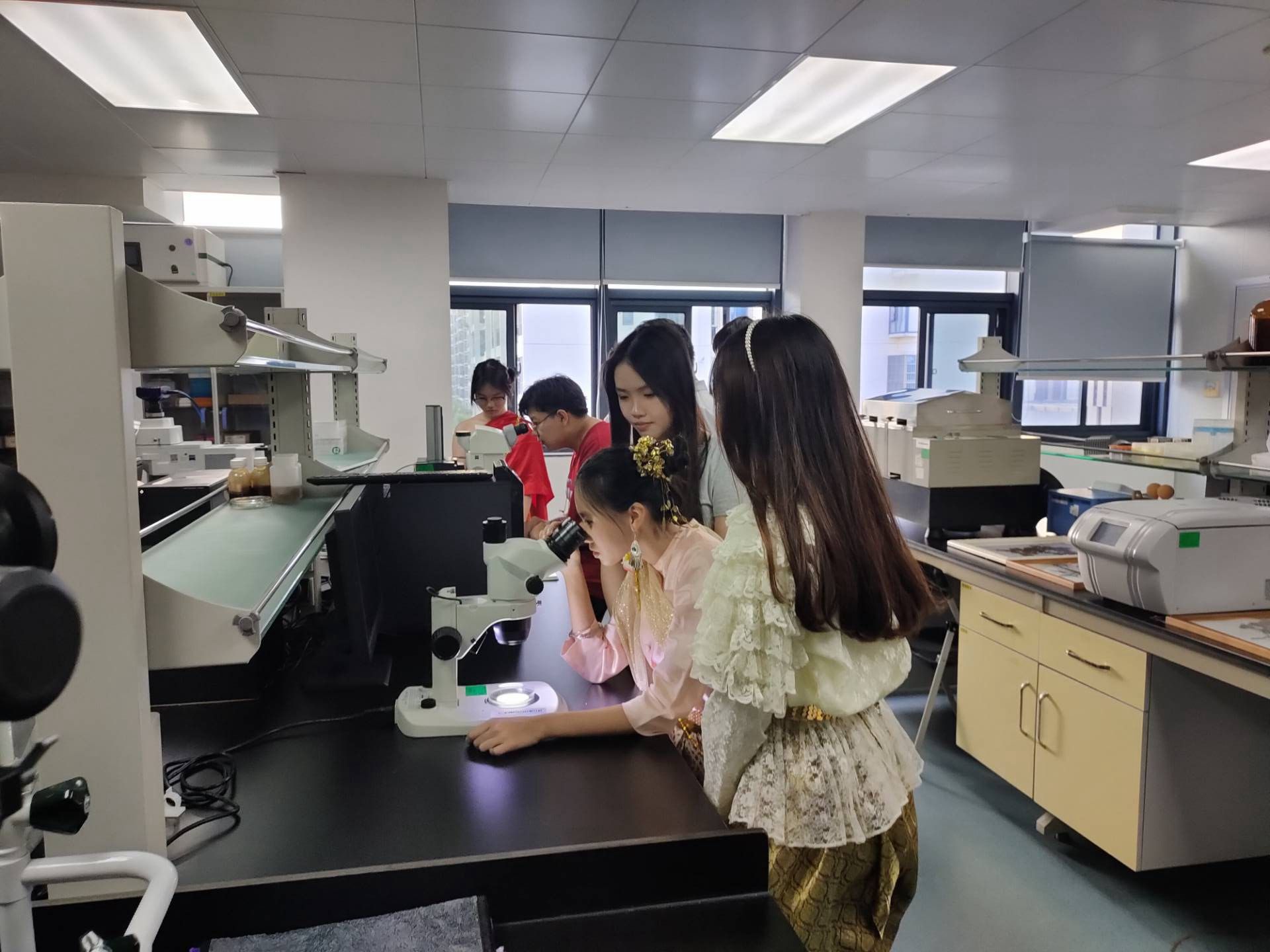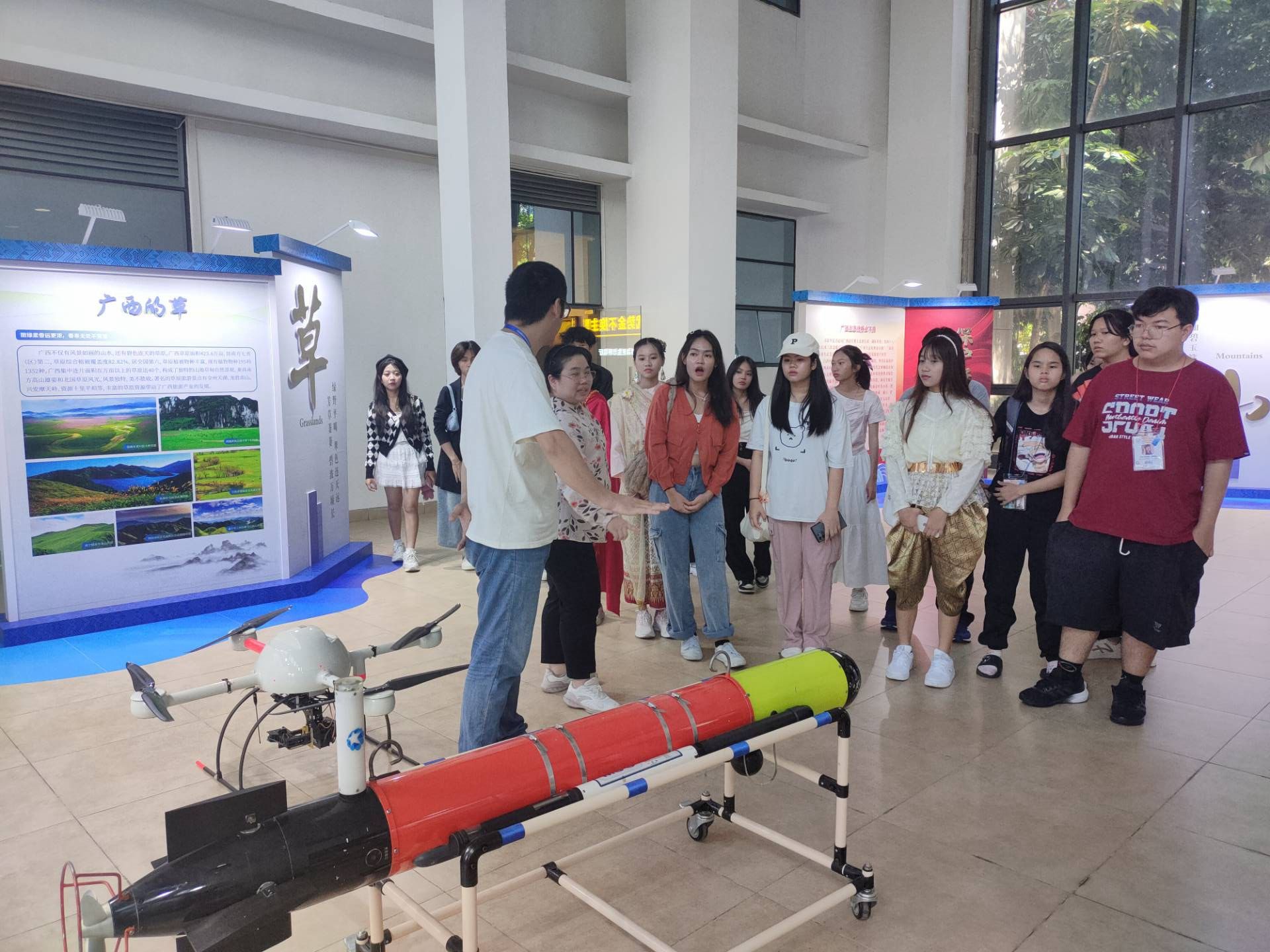 在活动中,中外师生首先参观了广西生态环境保护教育馆。通过一系列生动的展览和互动体验,全面了解了广西在生态环境保护方面的举措和取得的成效。随后,一行人前往大气复合污染物观测站,实地观摩了广西空气质量预报预警系统、卫星遥感监测秸秆禁烧管理系统、铁塔监控秸秆禁烧系统以及环境空气质量在线监测系统等核心设施的运行情况。在广西环境空气质量预报预警中心,专业工作人员为师生们详细介绍了空气质量预报预警的流程和方法,使他们对空气质量监测工作有了更为深入和直观的了解。此外,活动还安排了参观环境应急监测车、无人飞行器、无人船和无人潜航器等高科技环保设备的环节,展示了广西在环保监测和应急响应方面的先进技术和设备。最后,师生们还走进了重金属实验室和有机实验室,近距离观察了各类精密仪器设备的运作情况,对广西环保科研工作的严谨性和专业性有了更为深刻的认识。