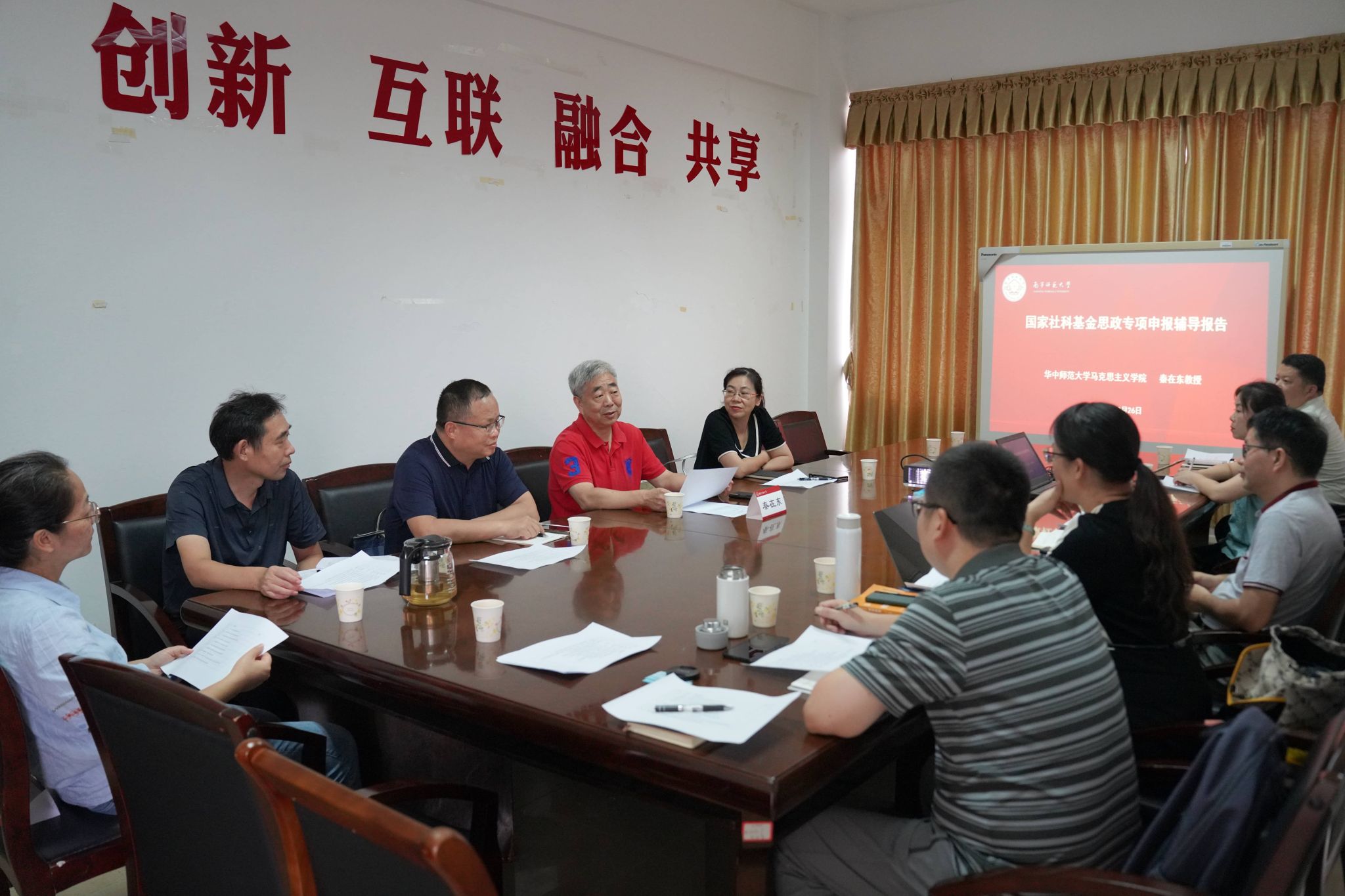 为做好2024年国家社科基金高校思想政治理论课研究专项申报工作,提高教师科研课题申报质量,2024年9月26日下午,马克思主义学院在明秀校区文星楼1209会议室召开课题申报辅导会。华中师范大学马克思主义学院秦在东教授应邀为马克思主义学院教师进行课题申报辅导。本次辅导会由马克思主义学院副院长王卫国副教授主持。