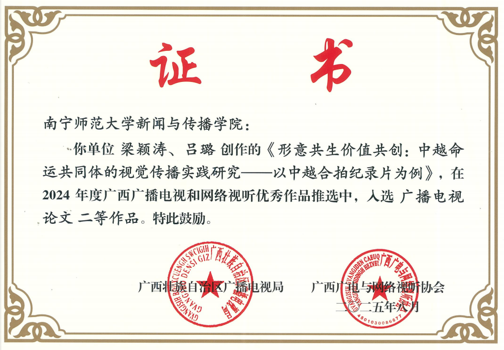 近日,广西壮族自治区广播电视局、广西广电与网络视听协会公布了2024年度广西广播电视和网络视听优秀作品推选结果,新闻与传播学院硕士研究生导师梁颖涛、刘雯双双获奖,为学院在学术研究与行业服务方面再添佳绩。