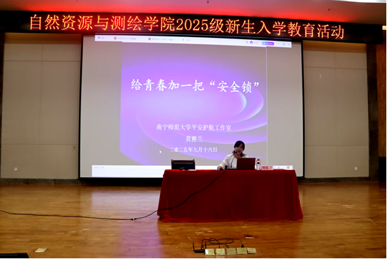 为切实提升2025级新生的安全防范意识与自我保护能力,助力其顺利适应大学新环境,9月16日,自然资源与测绘学院在图书馆报告厅举办新生安全教育专题讲座。本次讲座由学院党委副书记莫雅兰担任主讲,学院全体2025级新生参与讲座。
