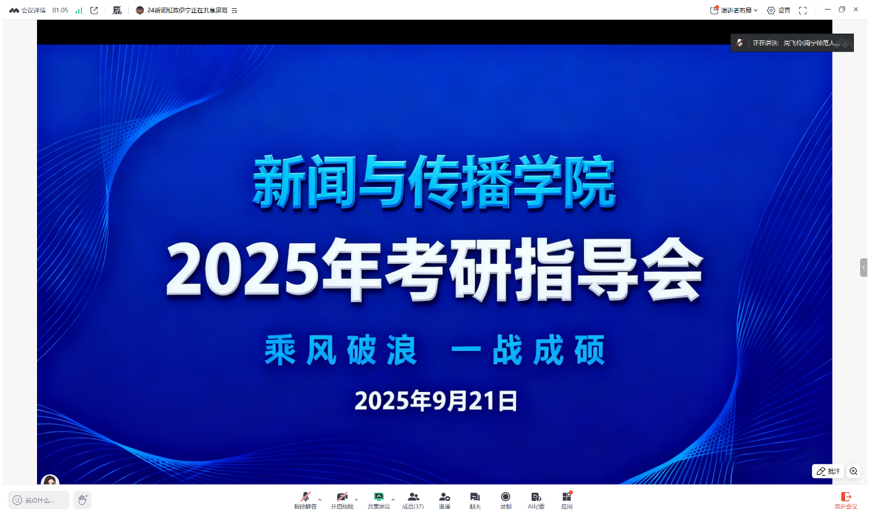 为切实帮助有考研意向的学生厘清备考思路、破解复习困惑,明确冲刺方向,9月21日晚,新闻与传播学院以线上会议形式成功举办了2025年考研指导会。学院院长梁颖涛、党委副书记黄敏、副院长周飞伶受邀出席并分享指导,2022级、2023级全体有考研计划的学生积极参会,会议由学院辅导员惠旋全程主持。