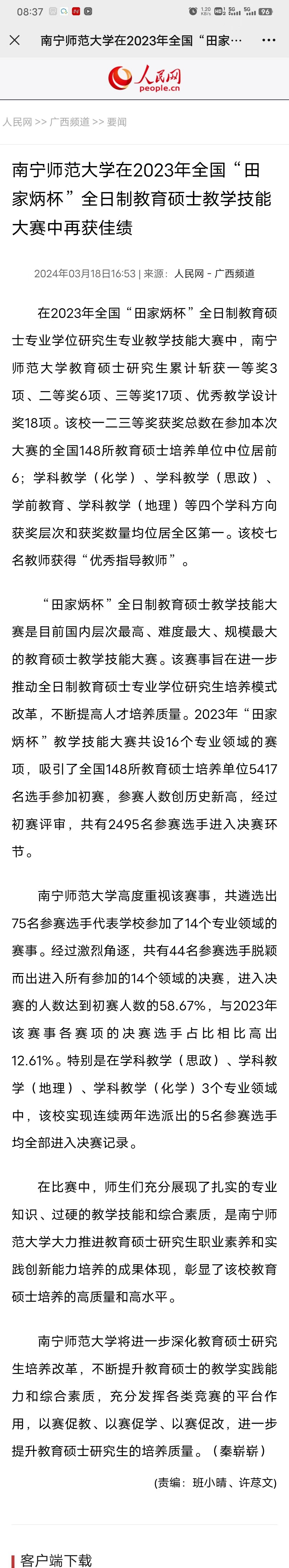 【人民网】南宁师范大学在2023年全国“田家炳杯”全日制教育硕士教学技能大赛中再获佳绩