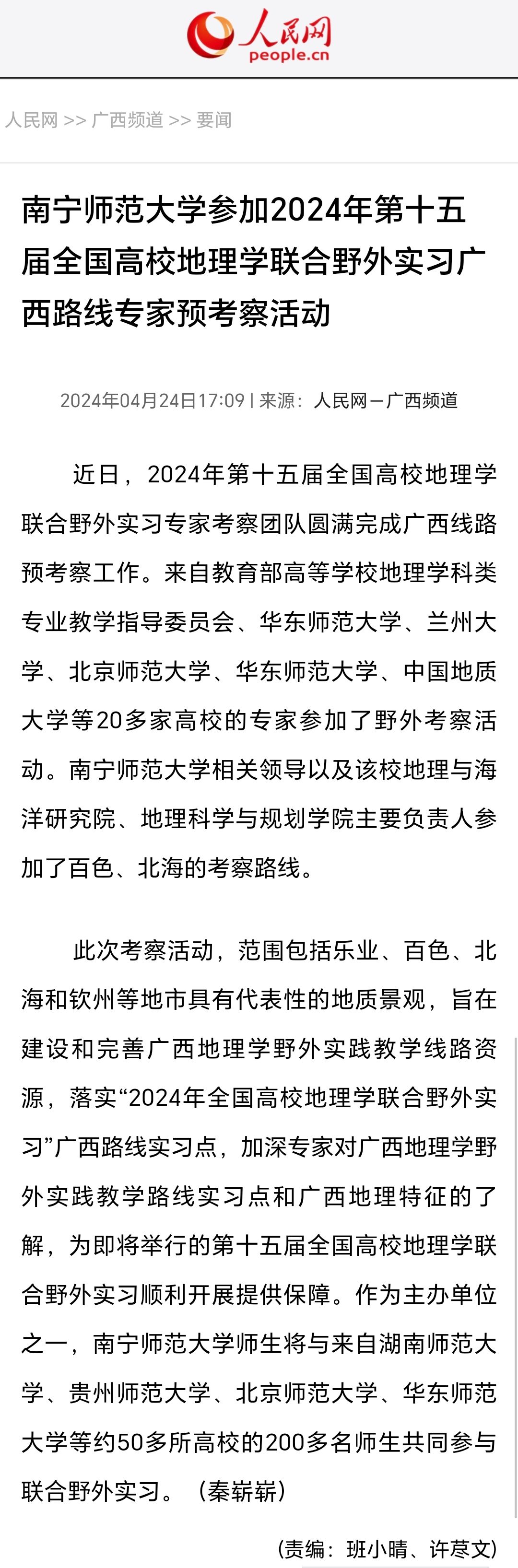 【人民网】南宁师范大学参加2024年第十五届全国高校地理学联合野外实习广西路线专家预考察活动