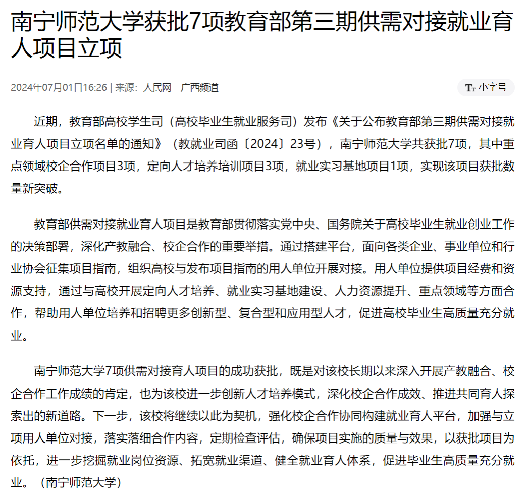 【人民网】南宁师范大学获批7项教育部第三期供需对接就业育人项目立项