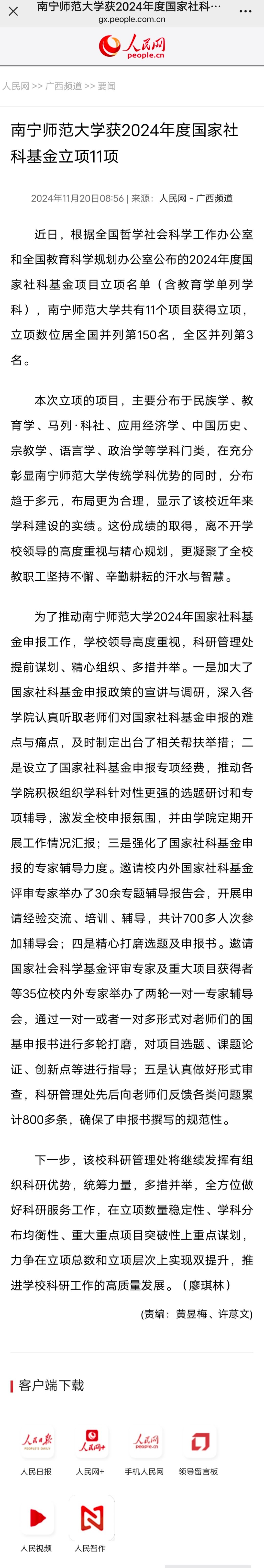 【人民网】南宁师范大学获2024年度国家社科基金立项11项
