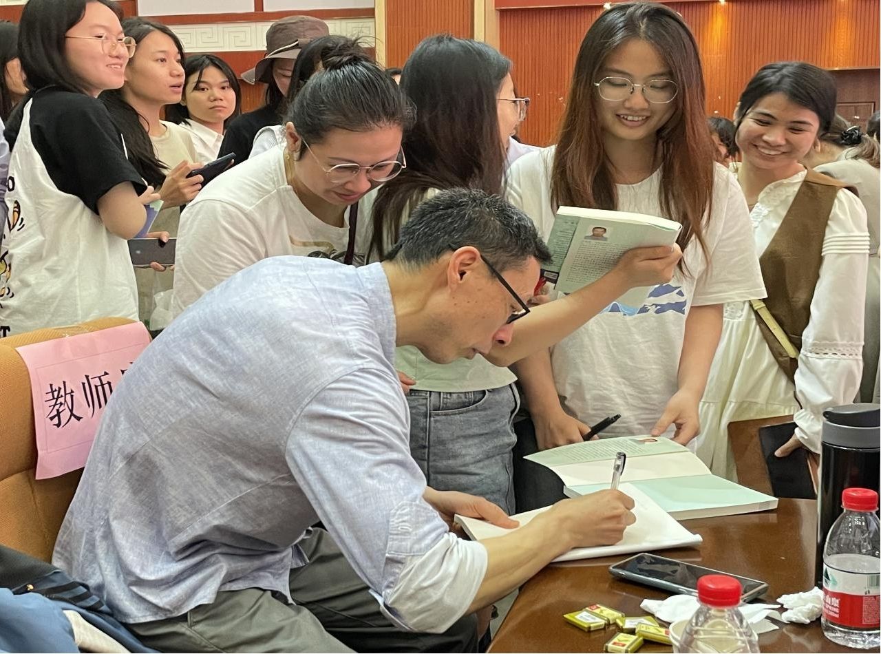 讲座结束后,同学们带着王编审编撰的教材排队请王编审签名,争先与王编审合影留念,“追星”激情燃爆现场。