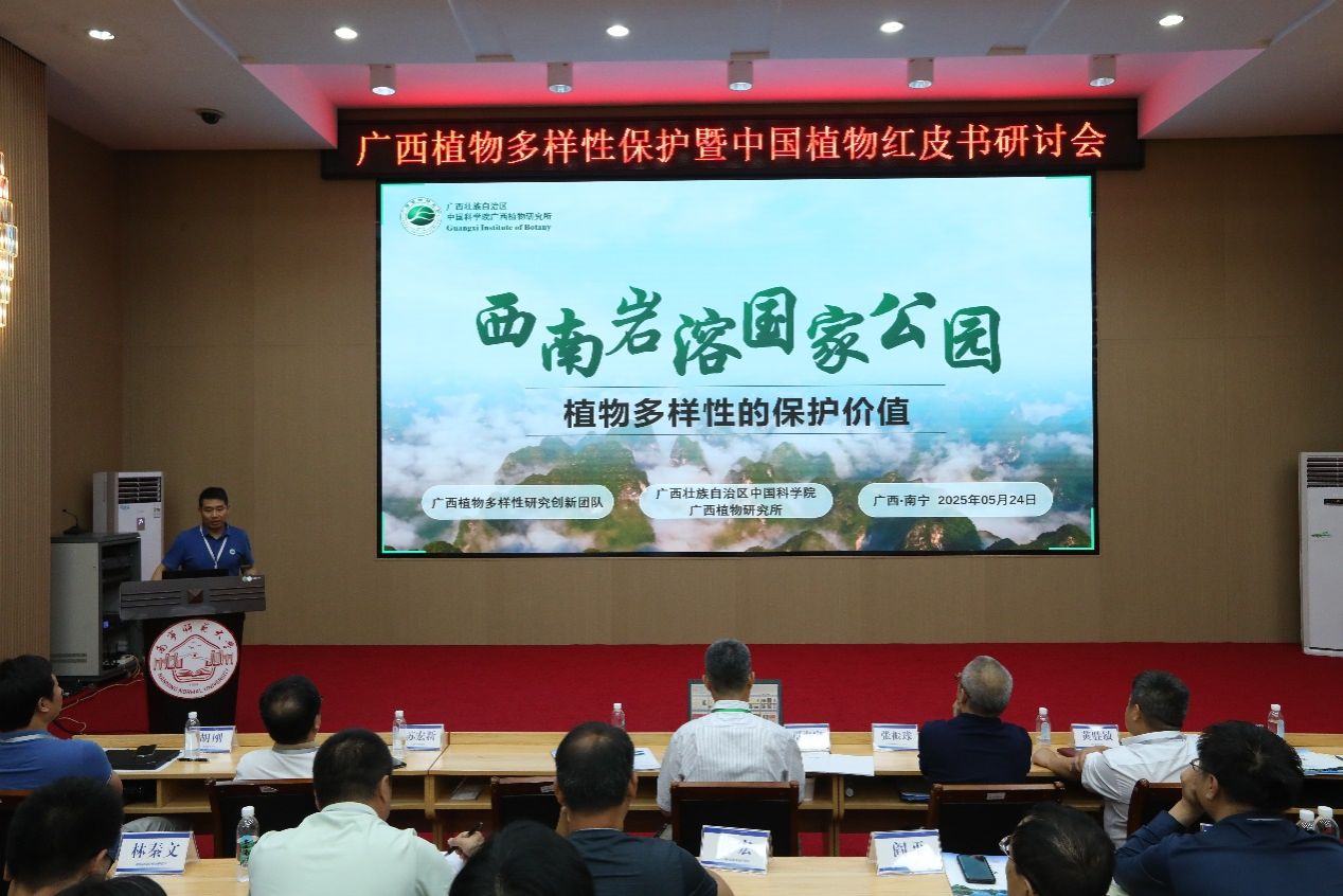 在特邀报告会议上,中国科学院生物多样性委员会副主任兼秘书长马克平、我校地理与海洋研究院党委书记黄胜敏和中国科学院植物研究所标本馆副馆长刘冰分别在开幕式致辞,我校地理与海洋研究院院长胡宝清出席会议,会议由覃海宁和南宁师范大学地理与海洋研究院副院长苏宏新主持。黄胜敏研究员在致辞中表示,会议旨在推动广西植物多样性科学研究的创新突破,提升科技工作者的监测与研究能力,更好地服务广西不断筑牢祖国南方重要生态屏障的战略目标,对推动广西地学学科建设及专业人才培养具有重要意义。广西壮族自治区林业局野生动植物保护处处长张振球、广西壮族自治区中国科学院广西植物研究所科研处处长许为斌、我校环境与生命科学学院胡刚教授以及中国科学院植物研究所覃海宁研究员分别作了题为《广西野生植物保护的实践与思考》《西南岩溶国家公园植物多样性的保护价值》《西南喀斯特森林的植物多样性格局:纬度与海拔的影响》《濒危物种红皮书的前世今生》的主旨报告,分享了广西植物多样性研究领域的最新研究成果以及已开展的植物多样性保护的成效,探讨了中国植物红皮书编写过程中涉及的濒危等级、评估标准、致危因子等方面的编写标准与解决对策。